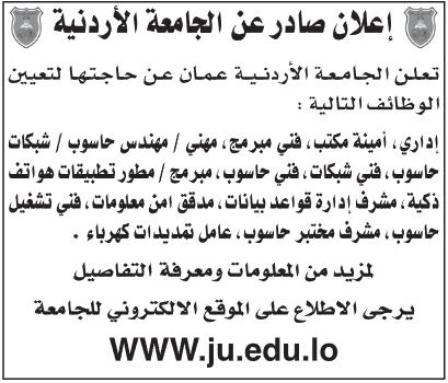 أعلنت الجامعة الأردنية عن حاجتها لتعيين عدد من الموظفين، كما دعت مرشحين لاستكمال إجراءات التعيين.