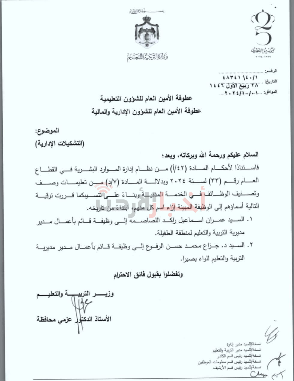 قرر وزير التربية والتعليم عزمي محافظة، تعيين عمران اللصاصمة قائما بأعمال مدير مديرية التربية والتعليم لمنطقة الطفيلة، وجزاع الرفوع قائما بأعمال مدير تربية لواء بصيرا