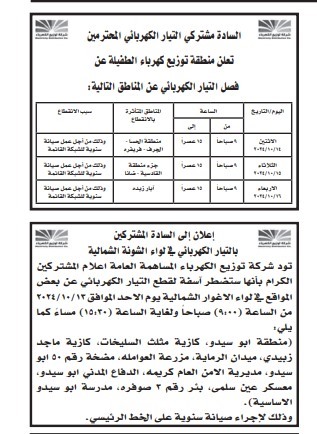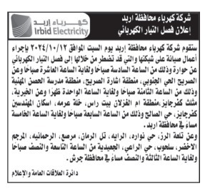 أعلنت شركتا كهرباء إربد وتوزيع الكهرباء عن فصل التيار الكهربائي في عدد من المناطق الواقعة ضمن اختصاصهما خلال الأسبوع المقبل، وذلك بهدف إجراء أعمال صيانة على الشبكة الكهربائية. وفيما يلي التفاصيل: