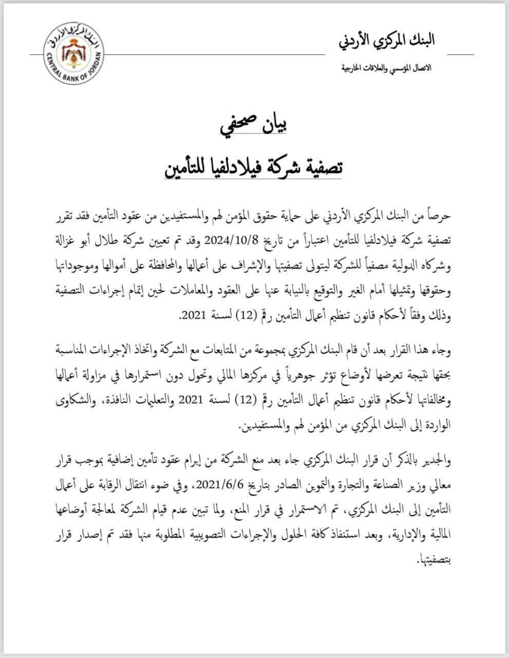 أعلن البنك المركزي الأردني، اليوم الثلاثاء، عن قراره بتصفية شركة فيلادلفيا للتأمين اعتبارًا من تاريخ 8 -10- 2024، وذلك في إطار حماية حقوق المؤمن لهم والمستفيدين من عقود التأمين. وفي بيان صحفي صدر عن البنك المركزي، أوضح أنه تم تعيين شركة طلال أبو غزالة وشركاه الدولية كمصفٍّ للشركة، للإشراف على أعمال التصفية والحفاظ على أموال وموجودات الشركة وحقوقها. كما سيتولى المصفّي تمثيل الشركة أمام الغير والتوقيع بالنيابة عنها على العقود والمعاملات حتى استكمال إجراءات التصفية.