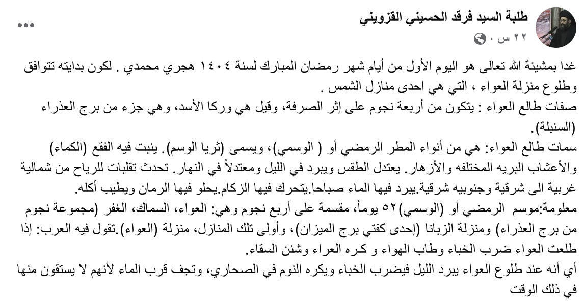 ونشرت الصفحة التي تعرّف نفسها أنّها لطلبة هذا الشيخ: "غدًا بمشيئة الله تعالى هو اليوم الأول من أيام شهر رمضان المبارك لسنة ١٤٠٤ هجري محمدي . لكون بدايته تتوافق وطلوع منزلة العواء ، التي هي احدى منازل الشمس"