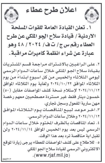أعلنت القيادة العامة للقوات المسلحة الأردنية / قيادة سلاح الجو الملكي عن طرح عطاء لشراء أنظمة كاميرات مراقبة. ودعت القيادة العامة الراغبين في الاشتراك بالعطاء إلى مراجعة قسم المشتريات في قيادة سلاح الجو الملكي خلال ساعات الدوام الرسمي يومي الثلاثاء والخميس من كل أسبوع، وذلك بدءًا من يوم الثلاثاء الموافق 22 /10/ 2024 وحتى يوم الثلاثاء الموافق 12 /11/ 2024، لاستلام نسخة من كشف المواصفات مقابل رسوم قدرها 50 دينارًا غير قابلة للاسترداد. وأوضحت القيادة أن المشاركين يجب أن يحضروا معهم رخصة مهن سارية المفعول وسجل تجاري. وأشارت إلى أن آخر موعد لبيع المناقصات سيكون يوم الثلاثاء الموافق 12 -10- 2024 خلال ساعات الدوام الرسمي.