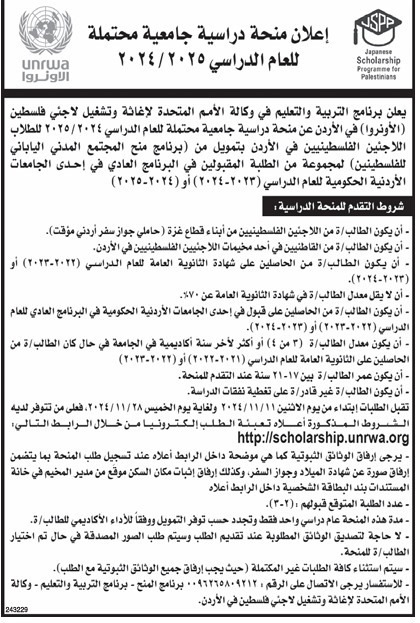 أعلن برنامج التربية والتعليم في وكالة الأمم المتحدة لإغاثة وتشغيل لاجئي فلسطين (الأونروا) في الأردن، اليوم الاثنين، عن توفر منح دراسية جامعية محتملة للعام الدراسي 2024-2025، وذلك بتمويل من برنامج منح المجتمع المدني الياباني للفلسطينيين، ومن اللجنة الوطنية للأونروا في الولايات المتحدة الأميركية (UNRWA USA National Committee)، إضافة إلى جهة خيرية أخرى لم يُفصح عن هويتها. وتم تحديد التفاصيل المتعلقة بهذه المنح في كل إعلان مرفق أدناه