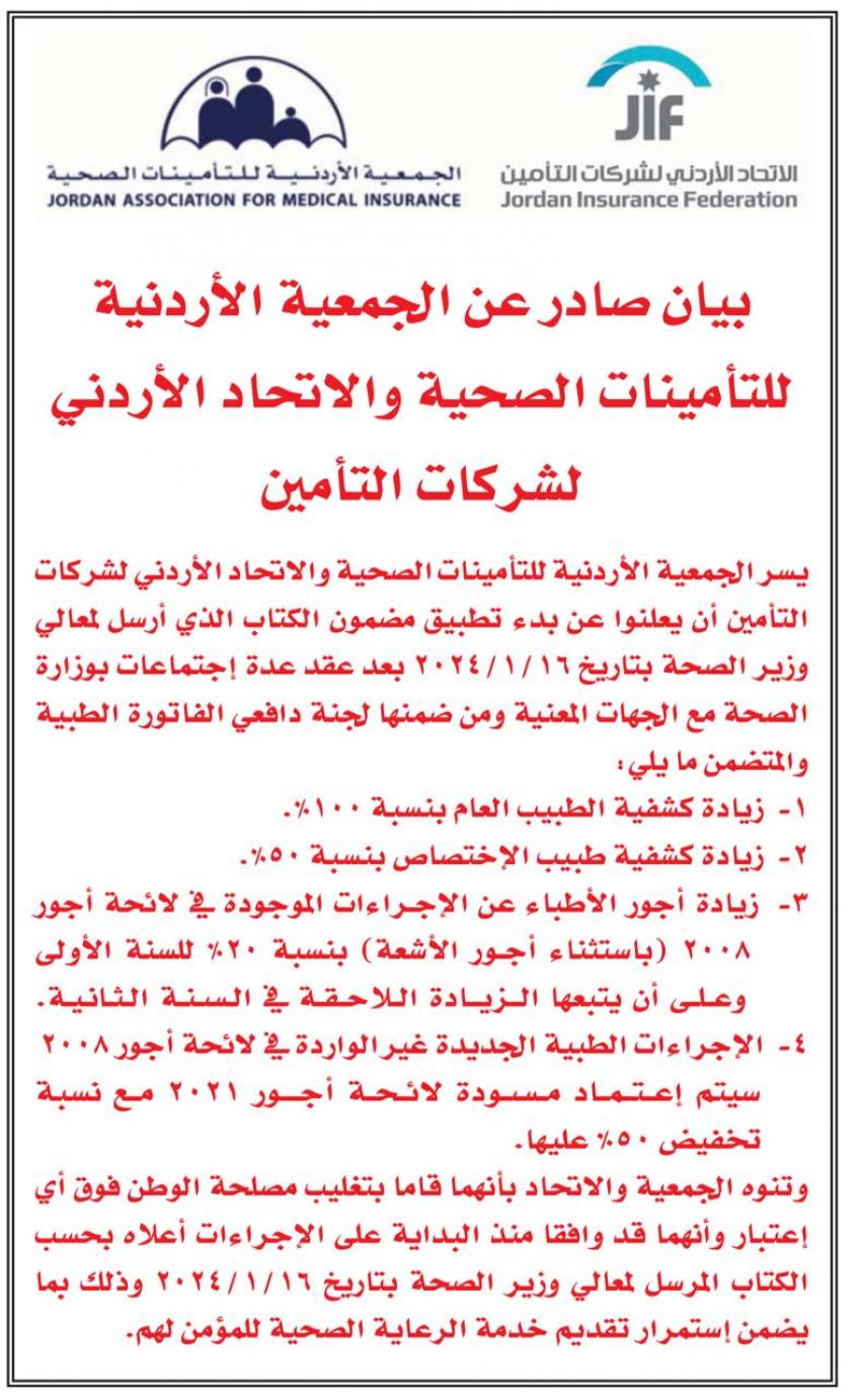 أعلن الاتحاد الأردني لشركات التأمين والجمعية الأردنية للتأمينات الصحية عن بدء تطبيق لائحة أجور طبية جديدة وفقًا الكتاب الذي أرسل لوزير الصحة بتاريخ 16/1/2024.