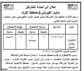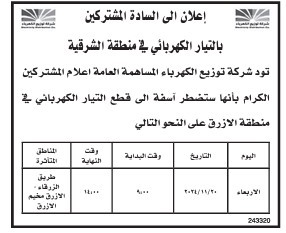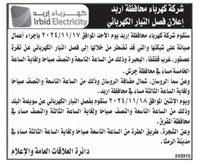أعلنت شركات الكهرباء، اليوم الخميس، عن قطع التيار الكهربائي في عدد من مناطق جرش، إربد، الرمثا، المفرق، الكرك، والأزرق، وذلك لأغراض الصيانة. وتم توضيح المناطق المتأثرة وأوقات الانقطاع المقررة ضمن كل إعلان كما هو مرفق أدناه، بهدف إتمام أعمال الصيانة اللازمة وضمان تحسين جودة الخدمة