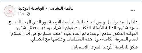 وقالت قائمة النشامى الطلابية: "بعد تواصل رئيس اتحاد طلبة الجامعة الأردنية نور الدين ال خطاب مع عميد شؤون الطلبة الأستاذ الدكتور صفوان الشياب ومدير وحدة الشؤون الدولية الدكتور سامح الزبيدي، تم إلغاء ندوة "منحة مشاريع من أجل السلام" لعدم المعرفة الكافية حول هذه المنظمات وعلاقتها مع الكيـان".