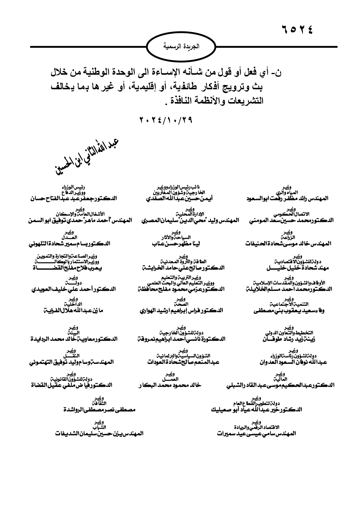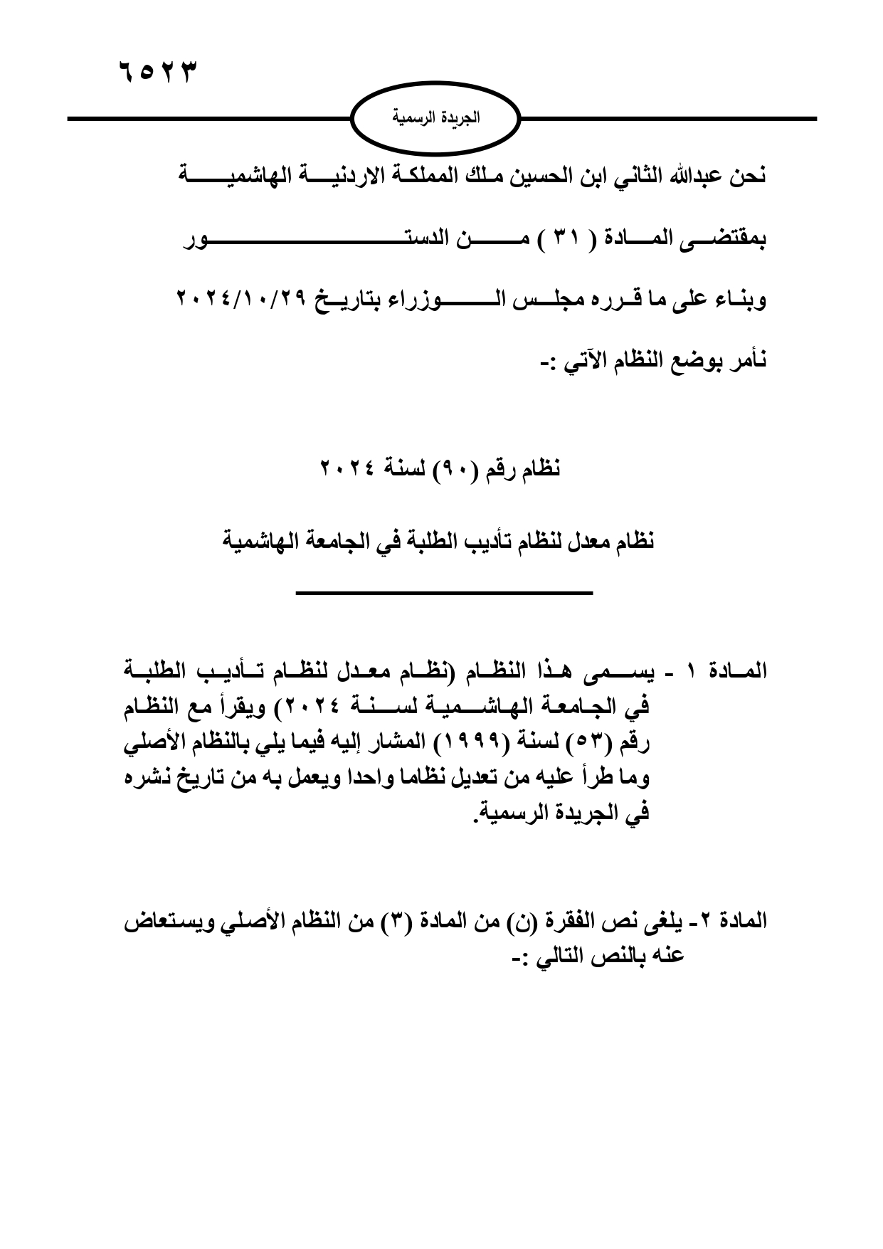 صدرت الارادة الملكية السامية بنظام معدل لنظام تأديب الطلبة في الجامعة الهاشمية يسمى هذا النظام نظام معدل لنظام تأديب الطلبة في الجامعة الهاشمية لسنة ٢٠٢٤) ويقرأ مع النظام رقم (٥٣) لسنة (۱۹۹۹) المشار إليه فيما يلي بالنظام الأصلي وما طرأ عليه من تعديل نظاما واحدا ويعمل به من تاريخ نشره في الجريدة الرسمية