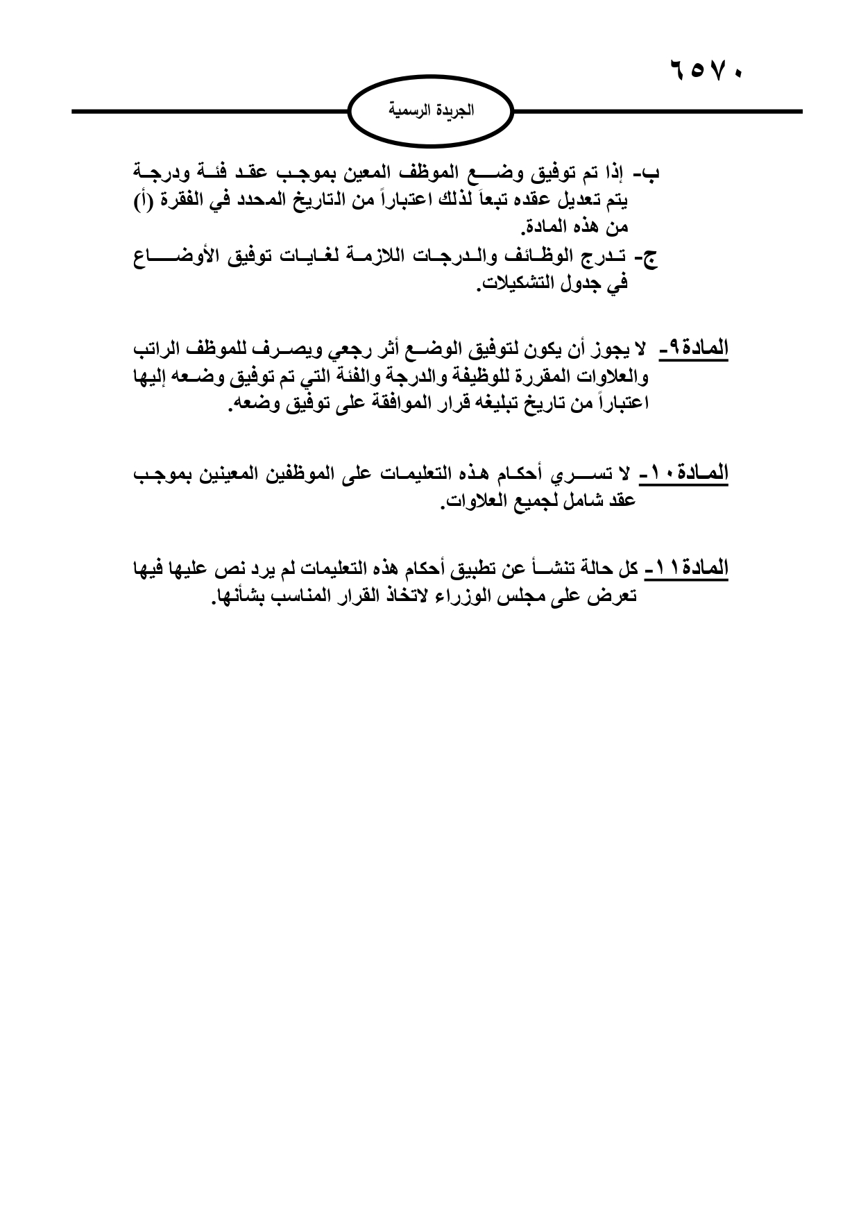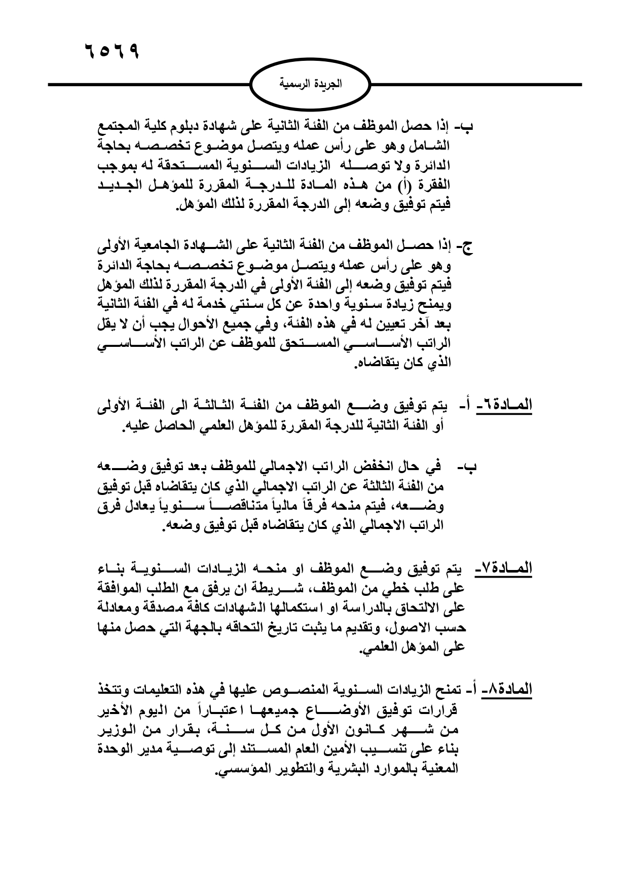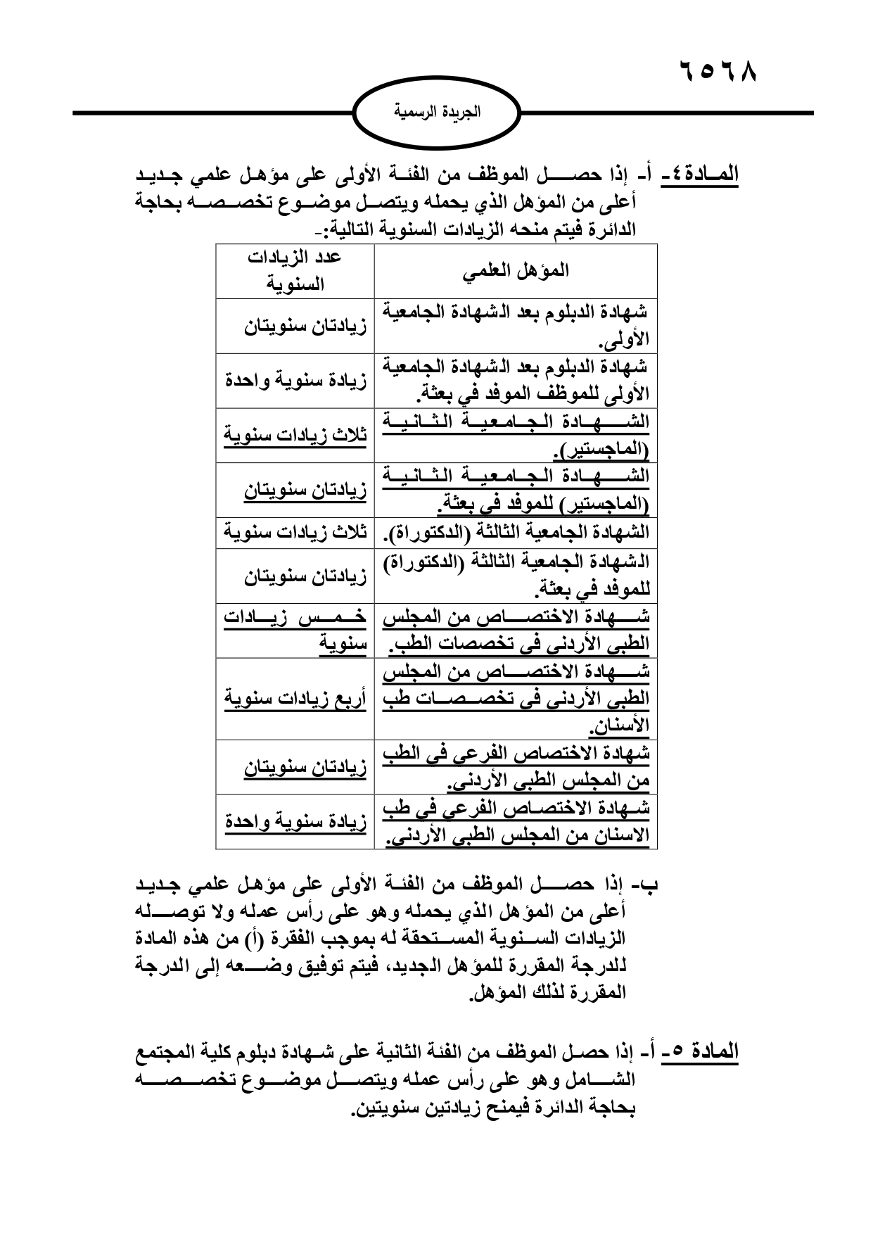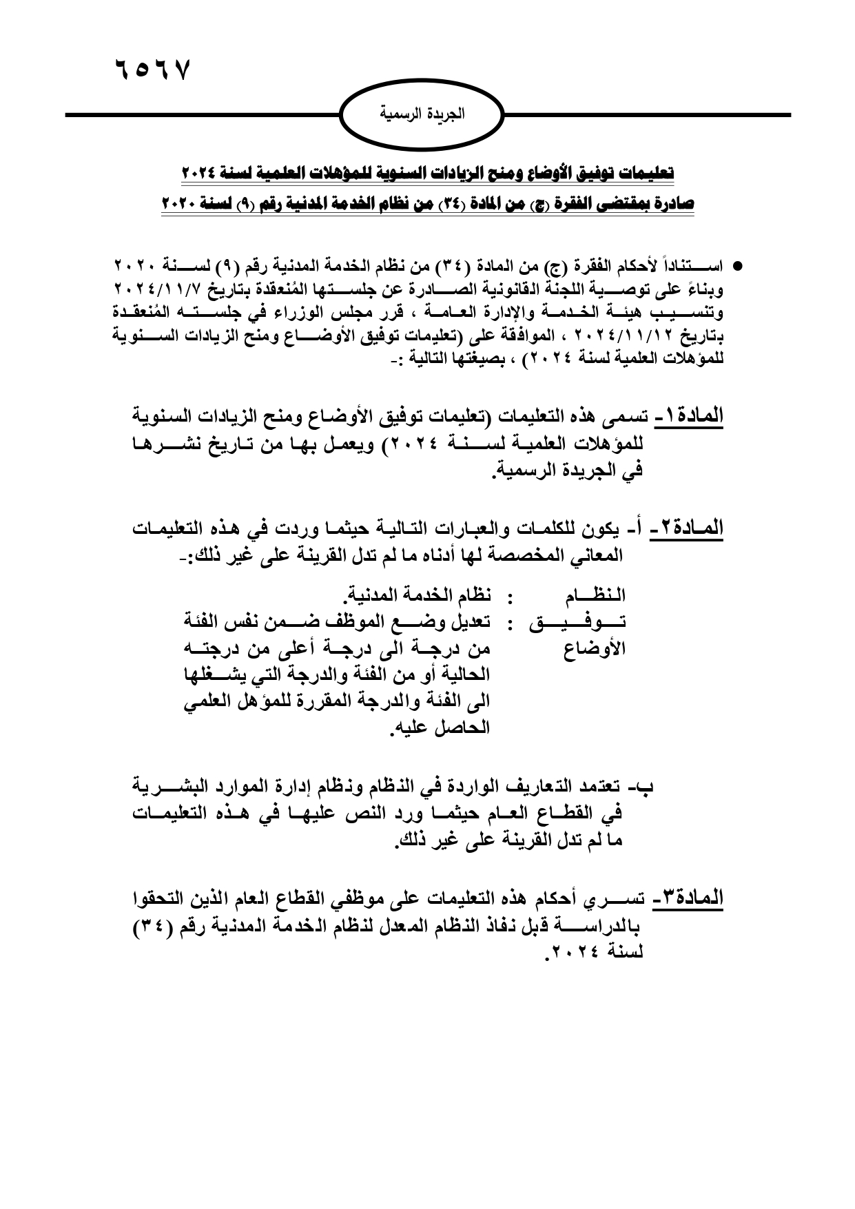 قرر مجلس الوزراء في جلسته المنعقدة بتاريخ ۲۰۲٤/۱۱/۱۲، الموافقة على تعليمات توفيق الأوضاع ومنح الزيادات السنوية للمؤهلات العلمية لسنة (٢٠٢٤) ، بصيغتها التالية :-