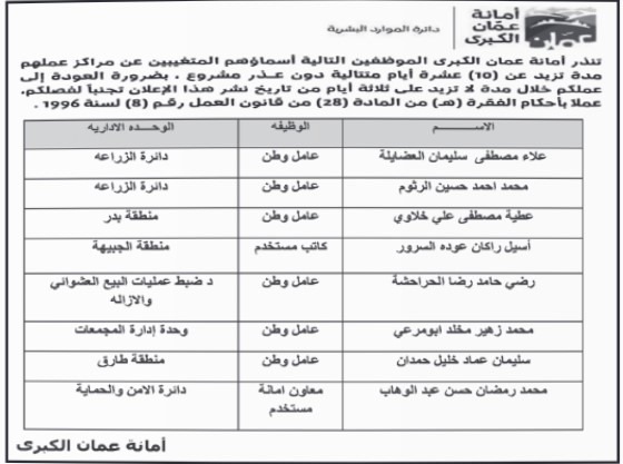 انذرت أمانة عمان الكبرى عمال وطن والتالية اسماؤهم بالعودة لعملهم خلال 3 أيام من تاريخ نشر هذا الاعلان نظرا لتغيبهم عن العمل 10 ايام متتالية دون عذر . واوضحت امانة عمان ان عدم الحضور سيترتب عليه الفصل وفقا لقانون الموارد البشرية.