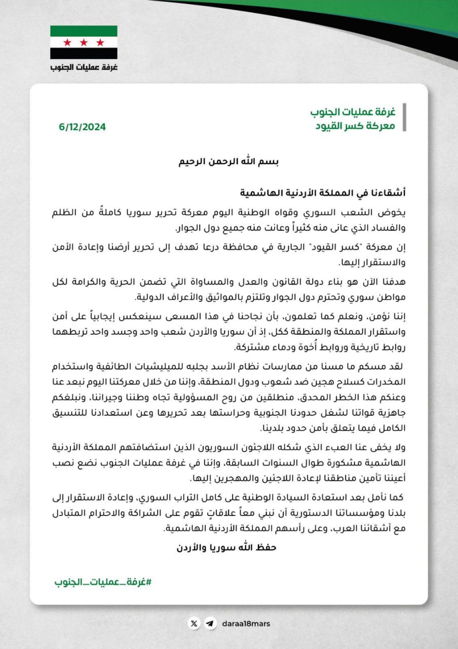 تناقل نشطاء على نطاق واسع رسالة صادرة عن ما يُسمى بـ"غرفة عمليات الجنوب"، التابعة لما يُعرف بـ"قيادة معركة كسر الجنوب"، أعلنت خلالها استعدادها للتنسيق مع الأردن بشأن تأمين الحدود. وأكدت الرسالة على أهمية التعاون لتحقيق الأمن والاستقرار في المنطقة الحدودية، مشيرة إلى أن التنسيق قد يشمل مكافحة تهريب المخدرات، إلى جانب قضايا أخرى تهدف إلى تعزيز الأمن المشترك، وفقاً لما ورد في الرسالة. وتأتي هذه الرسالة في ظل التطورات الميدانية التي يشهدها الجنوب السوري، وما يرافقها من تحديات أمنية على الحدود مع الأردن، وسط مساعٍ لتأمين الاستقرار ومنع النشاطات غير المشروعة التي تؤثر على المنطقة.