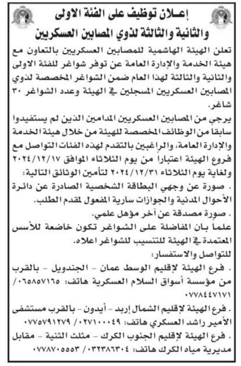 أعلنت الهيئة الهاشمية للمصابين العسكريين، بالتعاون مع هيئة الخدمة والإدارة العامة، عن إتاحة 30 فرصة عمل ضمن الفئات الأولى والثانية والثالثة، مخصصة لذوي المصابين العسكريين المسجلين لديها، وذلك ضمن خطتها لدعم أسر المصابين العسكريين وتحسين ظروفهم المعيشية. ودعت الهيئة المستفيدين الذين لم يسبق لهم الاستفادة من هذه الفرص الوظيفية، والراغبين في التقدم، إلى مراجعة فروع الهيئة في جميع المحافظات خلال الفترة الممتدة من يوم الثلاثاء الموافق 17 ديسمبر 2024 وحتى الثلاثاء 31 ديسمبر 2024.