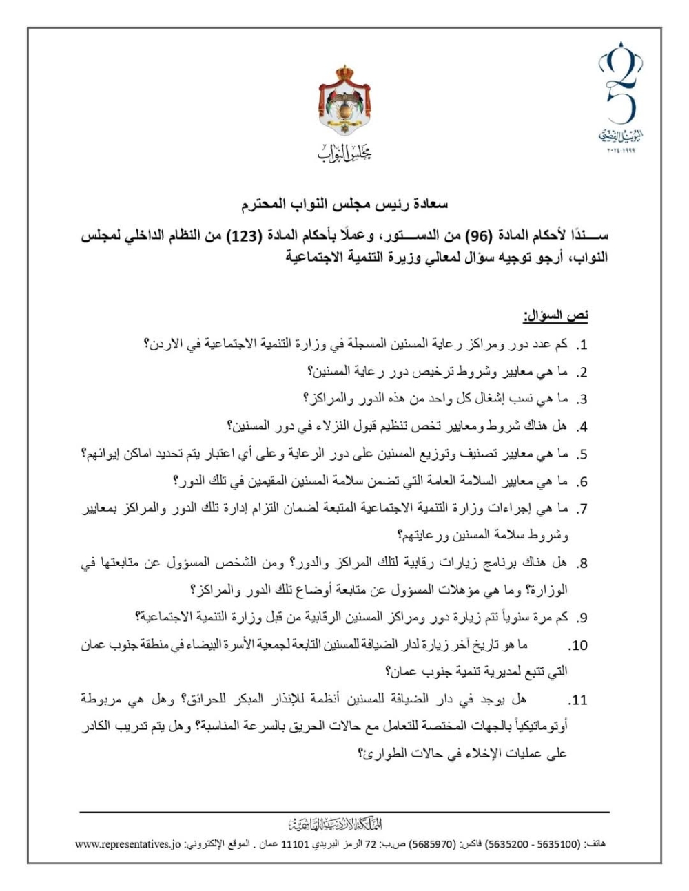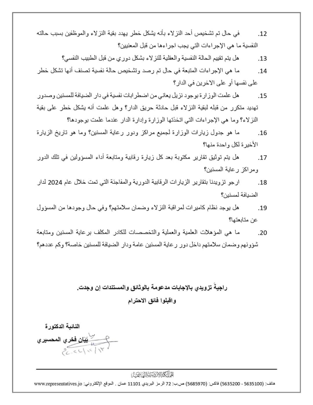 وجهت النائب الدكتورة بيان فخري المحسيري سؤالًا لوزيرة التنمية الاجتماعية وفاء بني مصطفى حول دور ومراكز رعاية المسنين المسجلة في وزارة التنمية الاجتماعية في الأردن، ومعايير وشروط ترخيصها. وتاليًا نص السؤال: