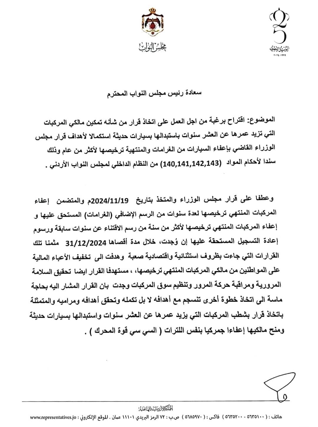 وعطفا على قرار مجلس الوزراء والمتخذ بتاريخ 19/11/2024م والمتضمن إعفاء المركبات المنتهي ترخيصها لعدة سنوات من الرسم الإضافي (الغرامات) المستحق عليها و إعفاء المركبات المنتهي ترخيصها لأكثر من سنة من رسم الاقتناء عن سنوات سابقة ورسوم إعادة التسجيل المستحقة عليها إن وُجدت، خلال مدة أقصاها 31/12/2024 مثمنا تلك القرارات التي جاءت بظروف استثنائية واقتصادية صعبة وهدفت الى تخفيف الأعباء المالية على المواطنين من مالكي المركبات المنتهي ترخيصها، ، مستهدفا القرار ايضا تحقيق السلامة المرورية ومراقبة حركة المرور وتنظيم سوق المركبات وجدت بان القرار المشار اليه بحاجة ماسة الى اتخاذ خطوة أخرى تنسجم مع أهدافه لا بل تكمله وتحقق أهدافه ومراميه والمتمثلة باتخاذ قرار بشطب المركبات التي يزيد عمرها عن العشر سنوات واستبدالها بسيارات حديثة ومنح مالكيها إعفاءا جمركيا بنفس اللترات ( السي سي قوة المحرك ) .