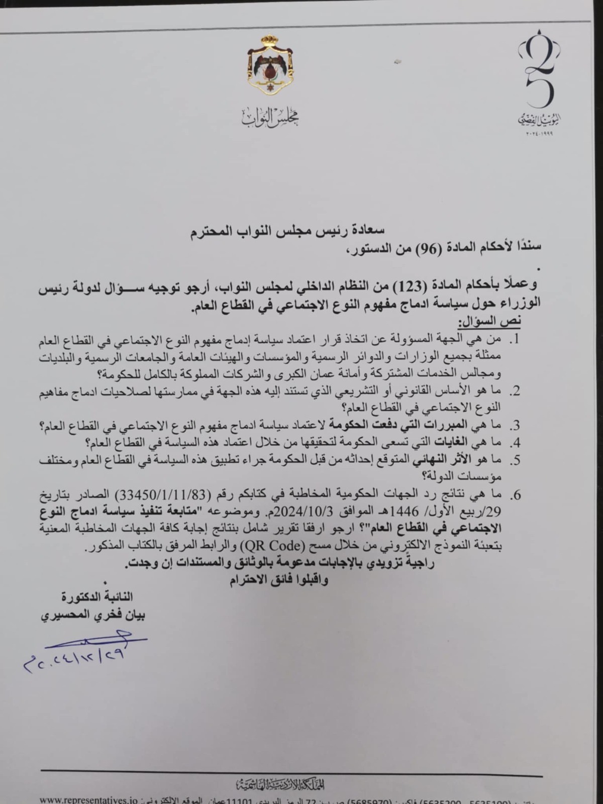 وجهت النائبة الدكتورة بيان المحسيري سؤالا نيابي للحكومة استفسر فيه عن الجهة المسؤولة عن القرار المتخذ في سياسة ادماج مفهوم النوع الاجتماعي في القطاع العام ممثلة بجميع الوزارات ومؤسسات الدولة والهيئات العامة الجامعات الرسمية و البلديات وأمانة عمان و الاساس القانوني الذي استند اليه المسؤول في تنفيذ القرار