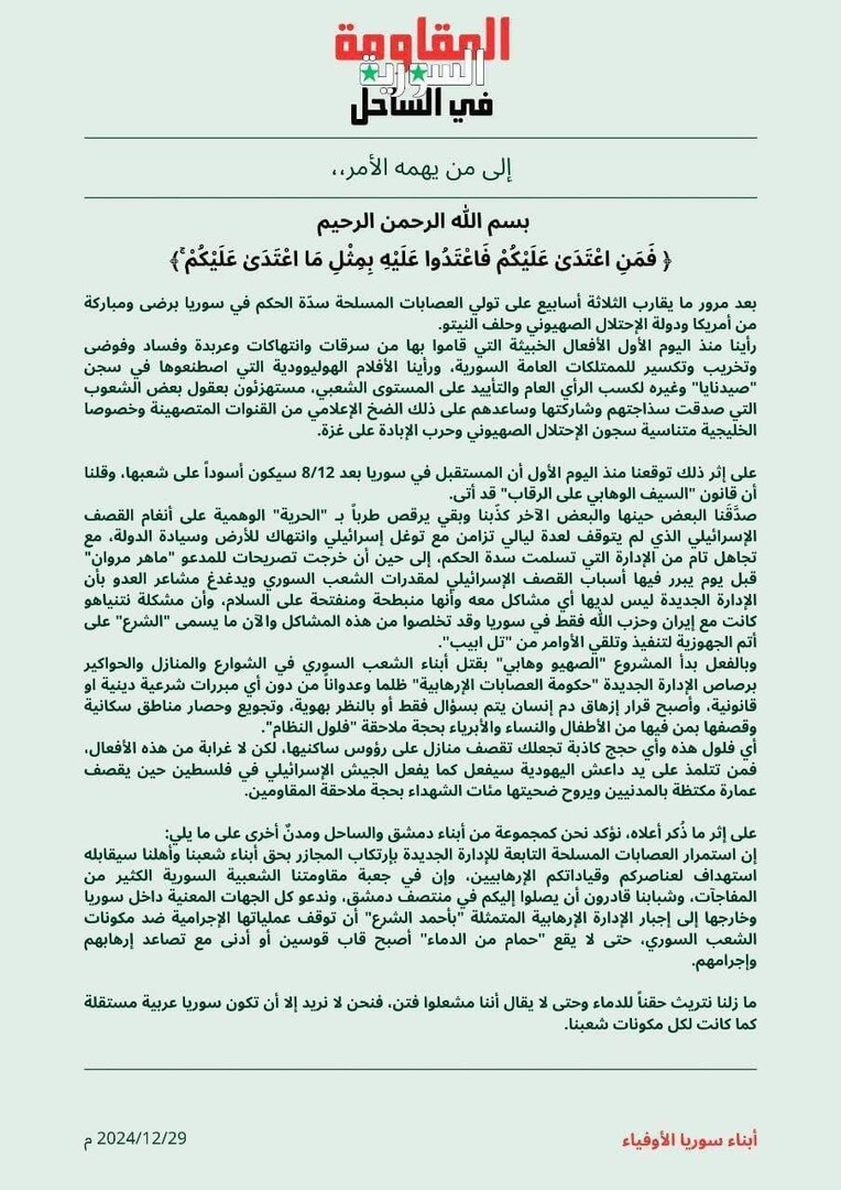 أصدرت مجموعة تطلق على نفسها "المقاومة السورية في الساحل" تضم أفرادا من دمشق والساحل ومدن أخرى بيانا يطالب السلطات السورية الجديدة بوقف "الانتهاكات" تفاديا لوقوع حمام دم في البلاد.