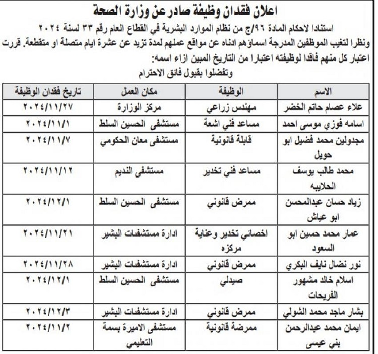أعلنت وزارة الصحة، اليوم الأحد، عن فقدان موظفين لوظائفهم، وذلك نظرا لتغيبهم عن مواقع عملهم لمدة تزيد عن 10 أيام متصلة أو متقطعة.