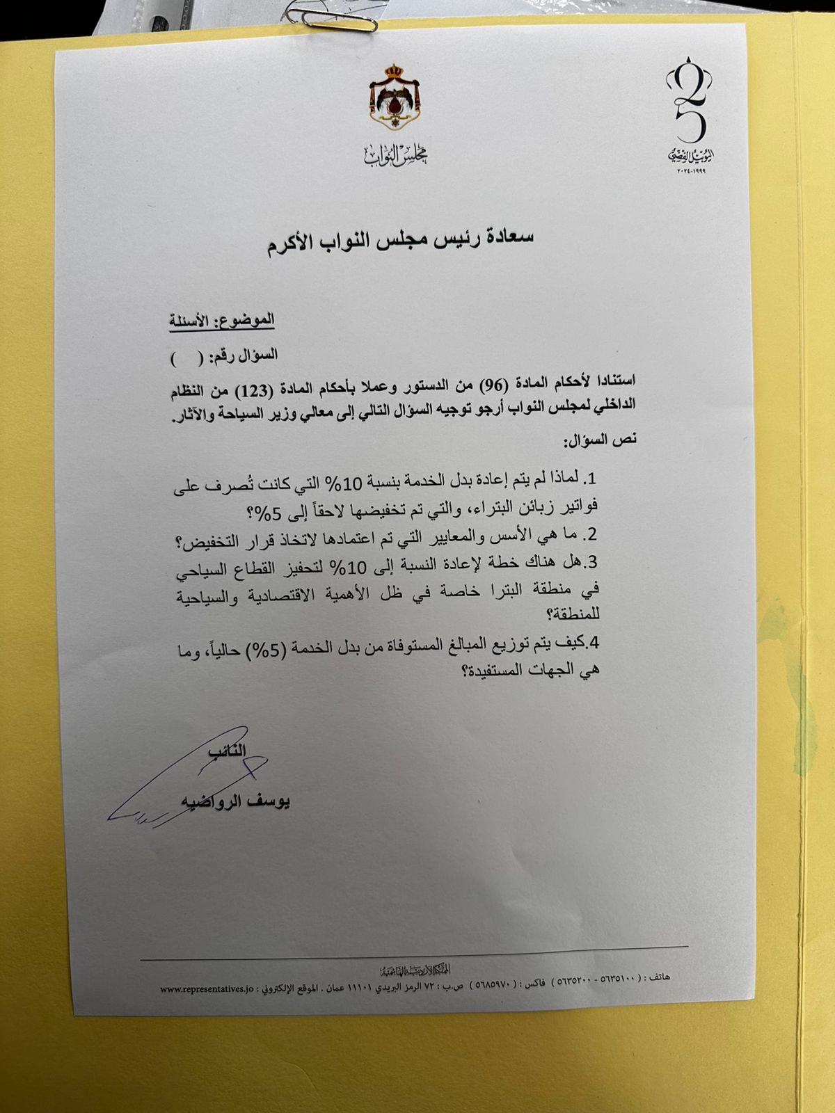 النائب الرواضية يفتح أبواب أسئلته نحو وزير السياحة وأمينه العام، ويستفسر عن بدل الخدمة