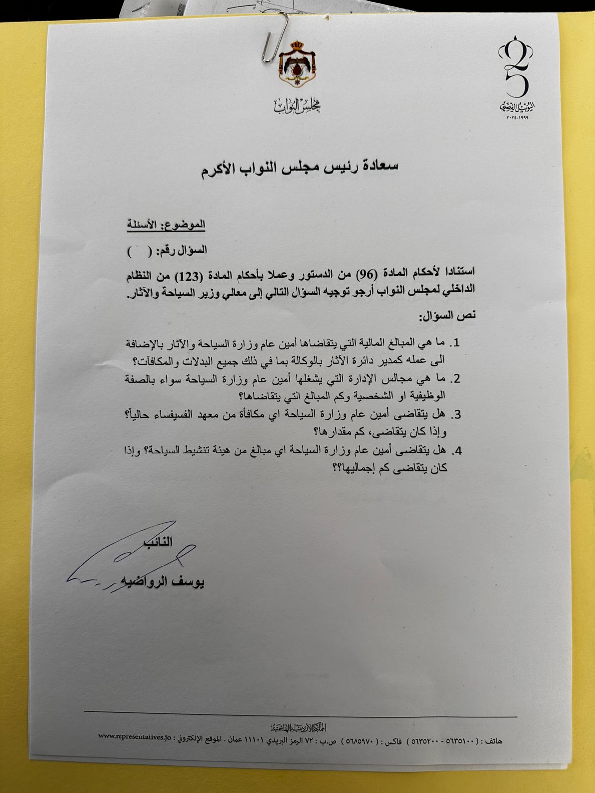 استنادا لأحكام المادة (96) من الدستور وعملا بأحكام المادة (123) من النظام الداخلي لمجلس النواب ارجو توجيه سؤالي إلى معالي وزير السياحة والآثار.