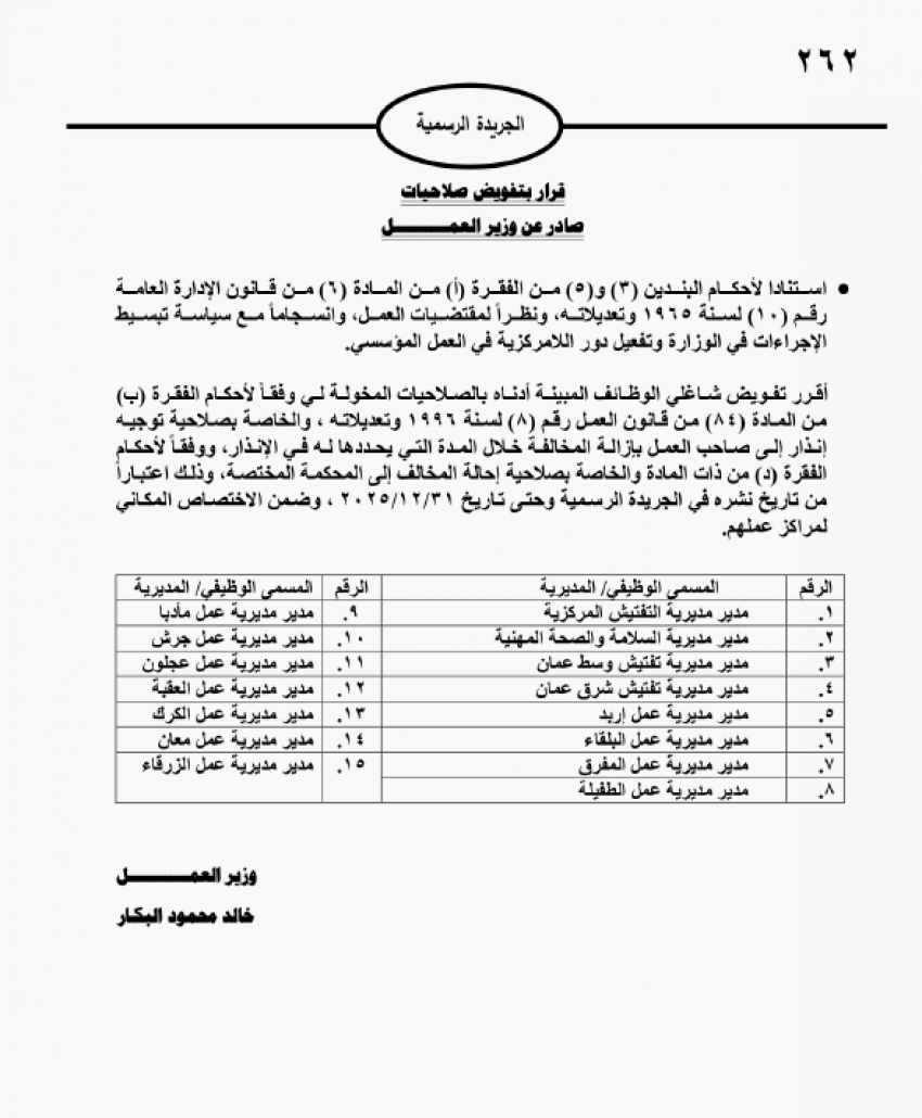 وجاء في القرار أنه الوزير يقر بتفويض شاغلي الوظائف المبينة بالصلاحيات المخولة له وفقًا لأحكام الفقرة ب من المادة 84 من قانون العمل رقم 8 لسنة 1996 وتعديلاته والخاصة بصلاحيات توجيه إنذار إلى صاحب العمل بإزالة المخالفة خلال المدة التي يحددها له في الانذار.