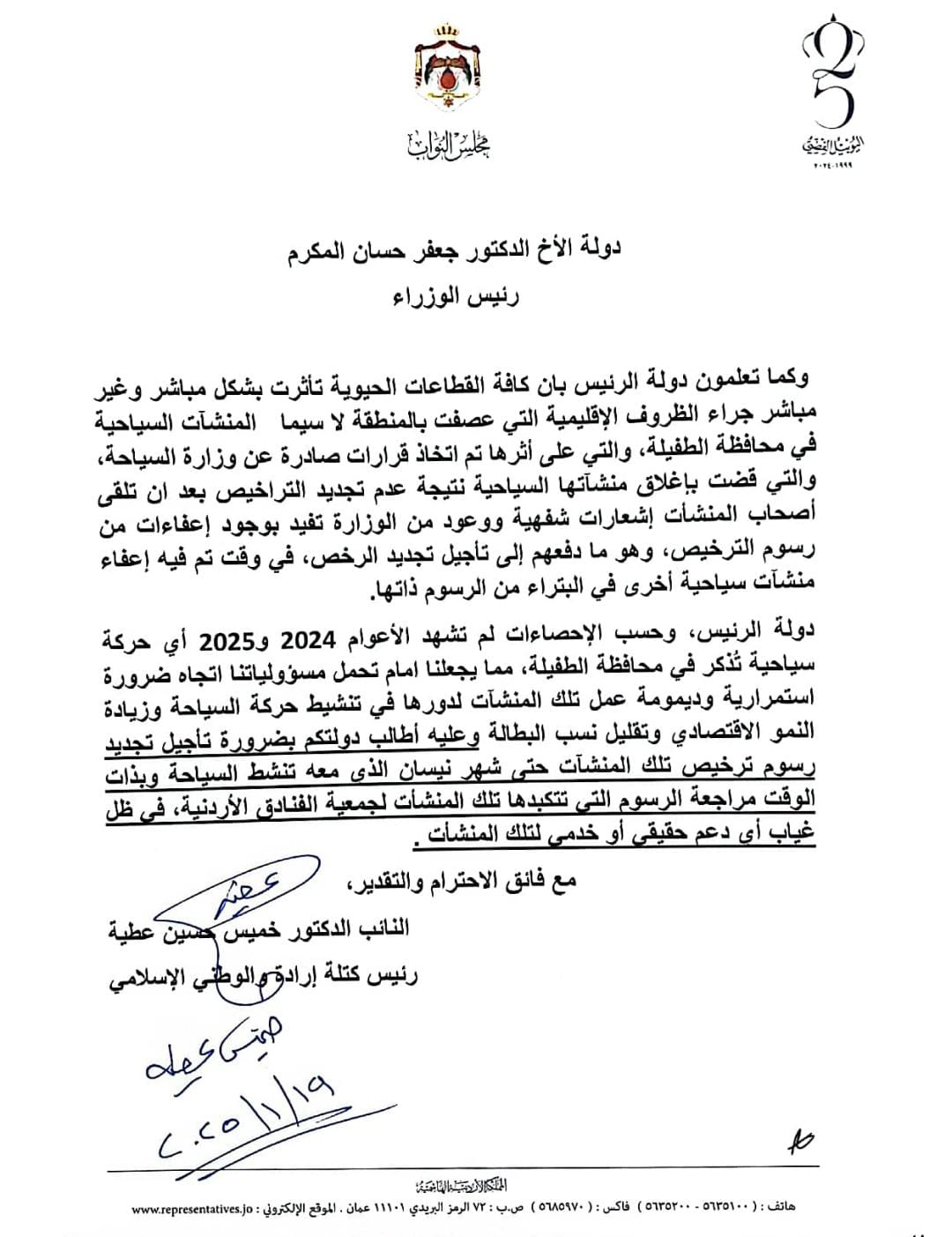 دولة الرئيس، وحسب الإحصاءات لم تشهد الأعوام 2024 و2025 أي حركة سياحية تُذكر في محافظة الطفيلة، مما يجعلنا امام تحمل مسؤولياتنا اتجاه ضرورة استمرارية وديمومة عمل تلك المنشآت لدورها في تنشيط حركة السياحة وزيادة النمو الاقتصادي وتقليل نسب البطالة وعليه أطالب دولتكم بضرورة تأجيل تجديد رسوم ترخيص تلك المنشآت حتى شهر نيسان الذي معه تنشط السياحة وبذات الوقت مراجعة الرسوم التي تتكبدها تلك المنشأت لجمعية الفنادق الأردنية، في ظل غياب أي دعم حقيقي أو خدمي لتلك المنشأت .