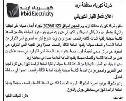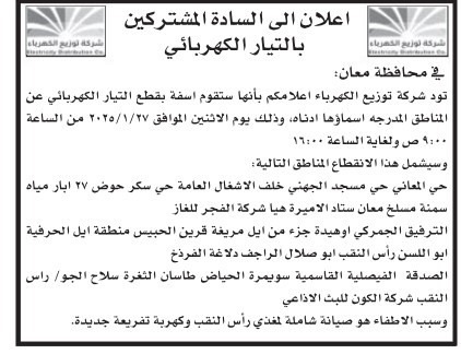 فصل مبرمج للكهرباء بمناطق في معان وإربد والمفرق وجرش