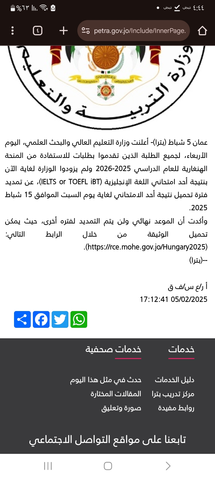 وأكدت أن الموعد نهائي ولن يتم التمديد لفتره أخرى، حيث يمكن تحميل الوثيقة من خلال الرابط التالي: (https://rce.mohe.gov.jo/Hungary2025).