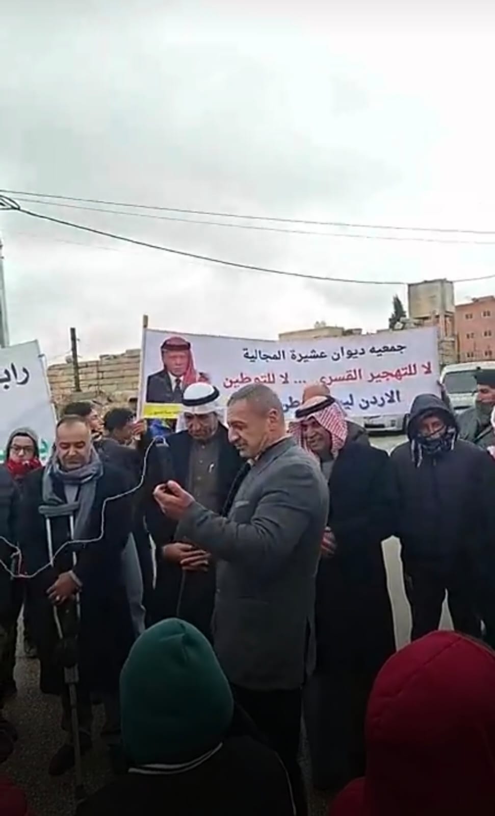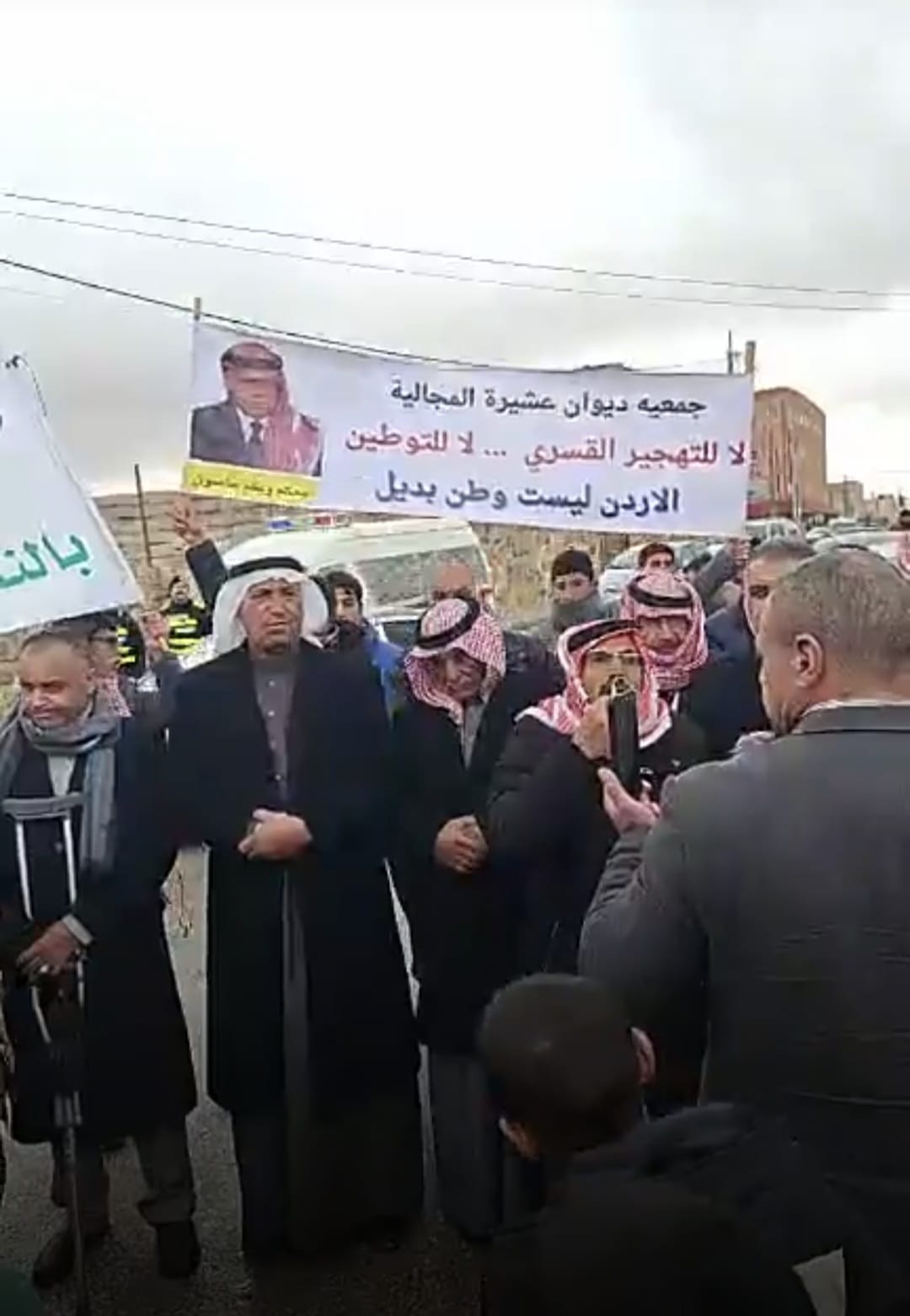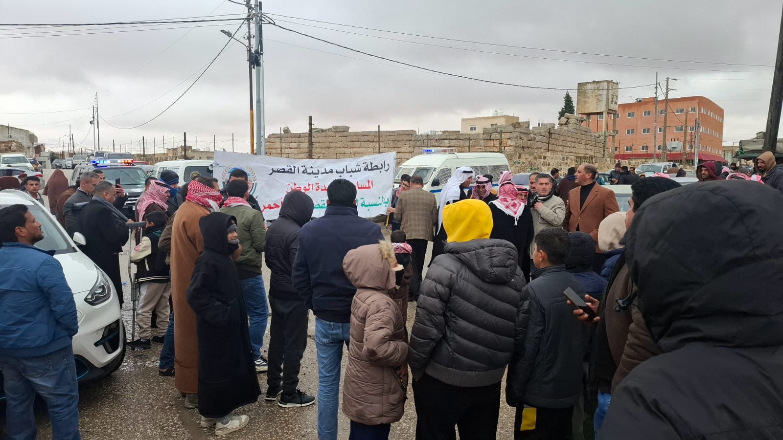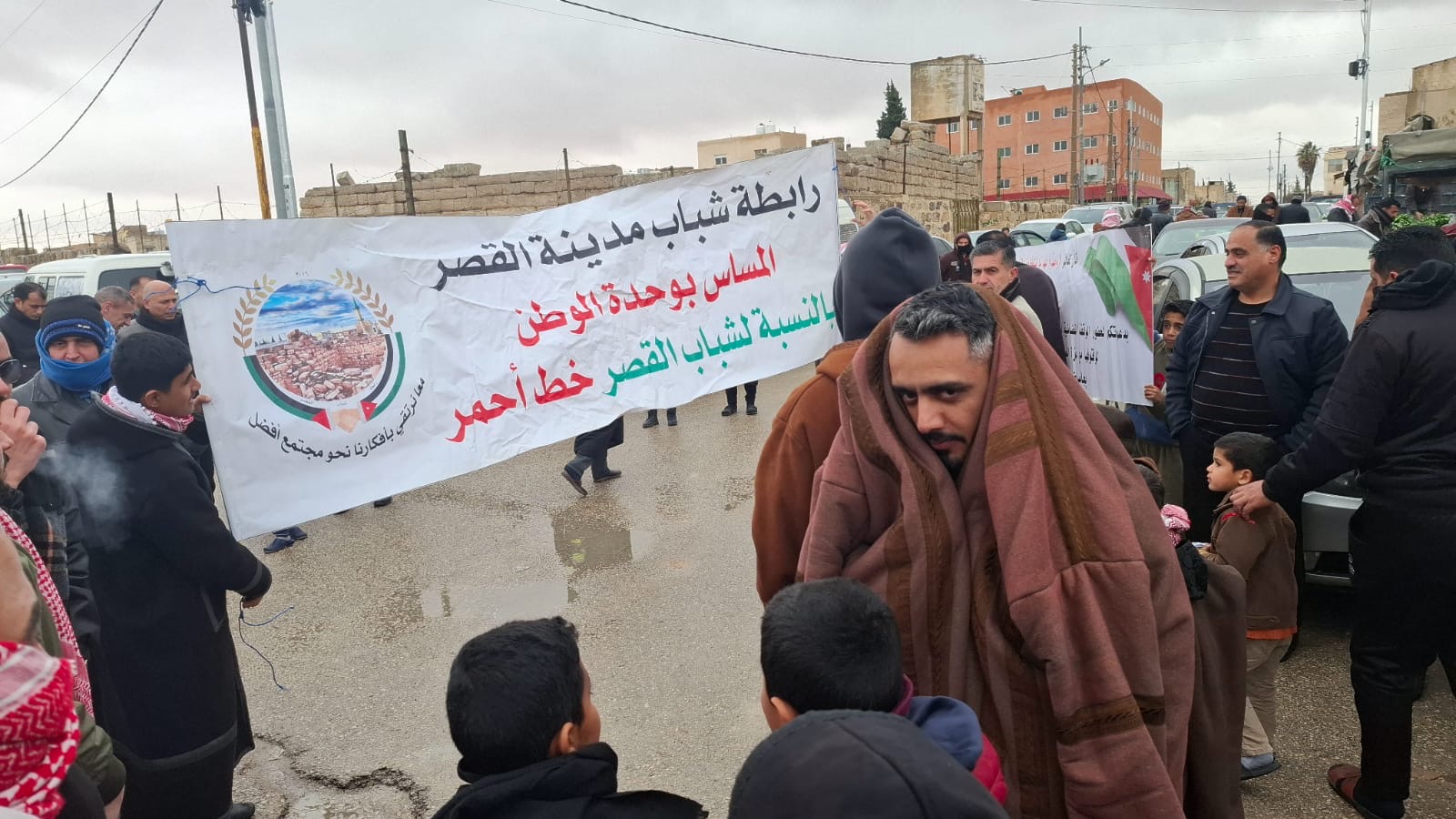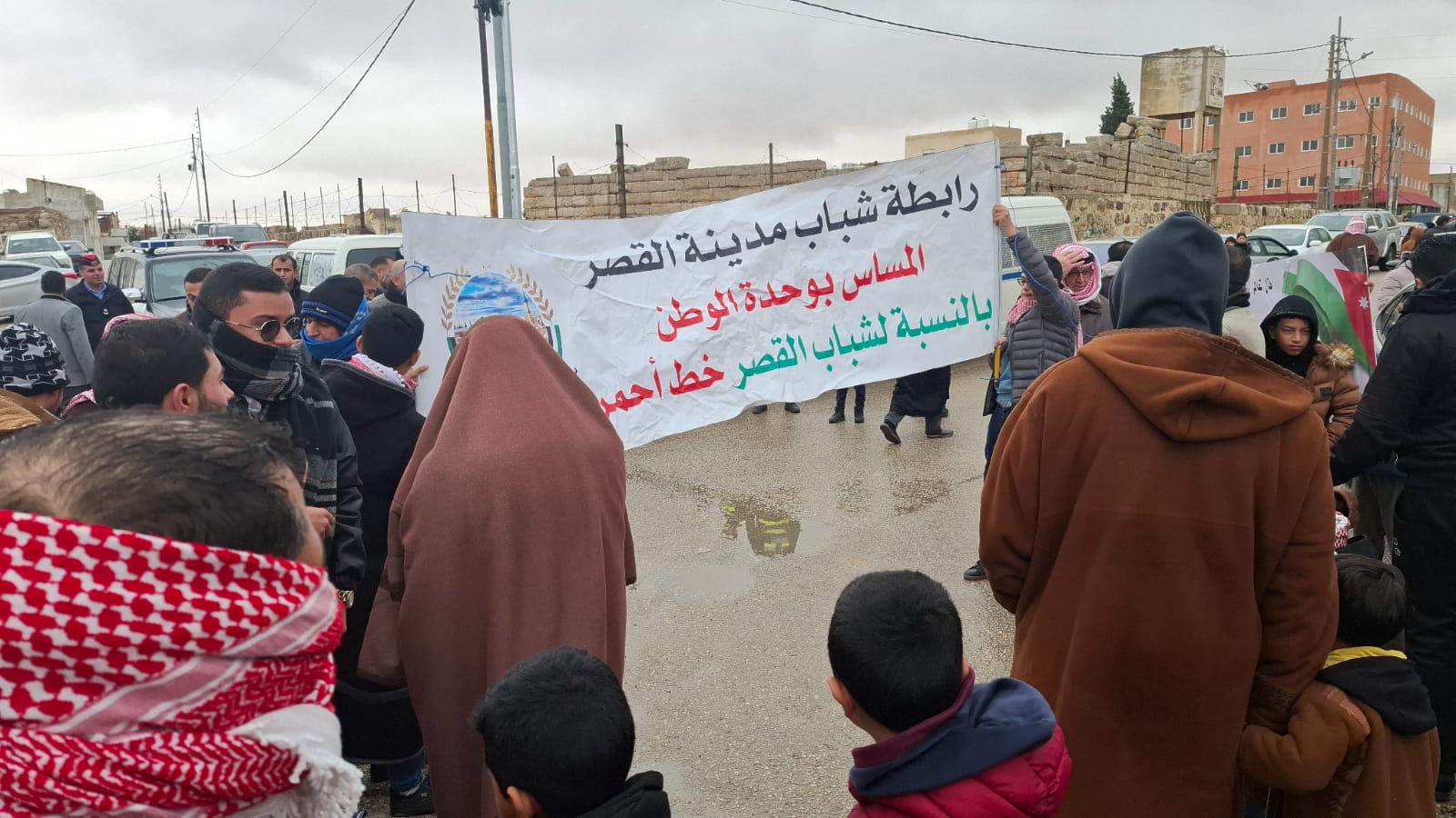 تصوير محمود المجالي - بتنظيم من رابطة شباب مدينة القصر، نُظمت وقفة احتجاجية يوم الجمعة الموافق 7 فبراير 2025، بلواء القصر وذلك للتعبير عن دعمهم للملك عبد الله الثاني ورفضهم لمشروع تهجير الفلسطينيين من قطاع غزة إلى كل من مصر والأردن.
