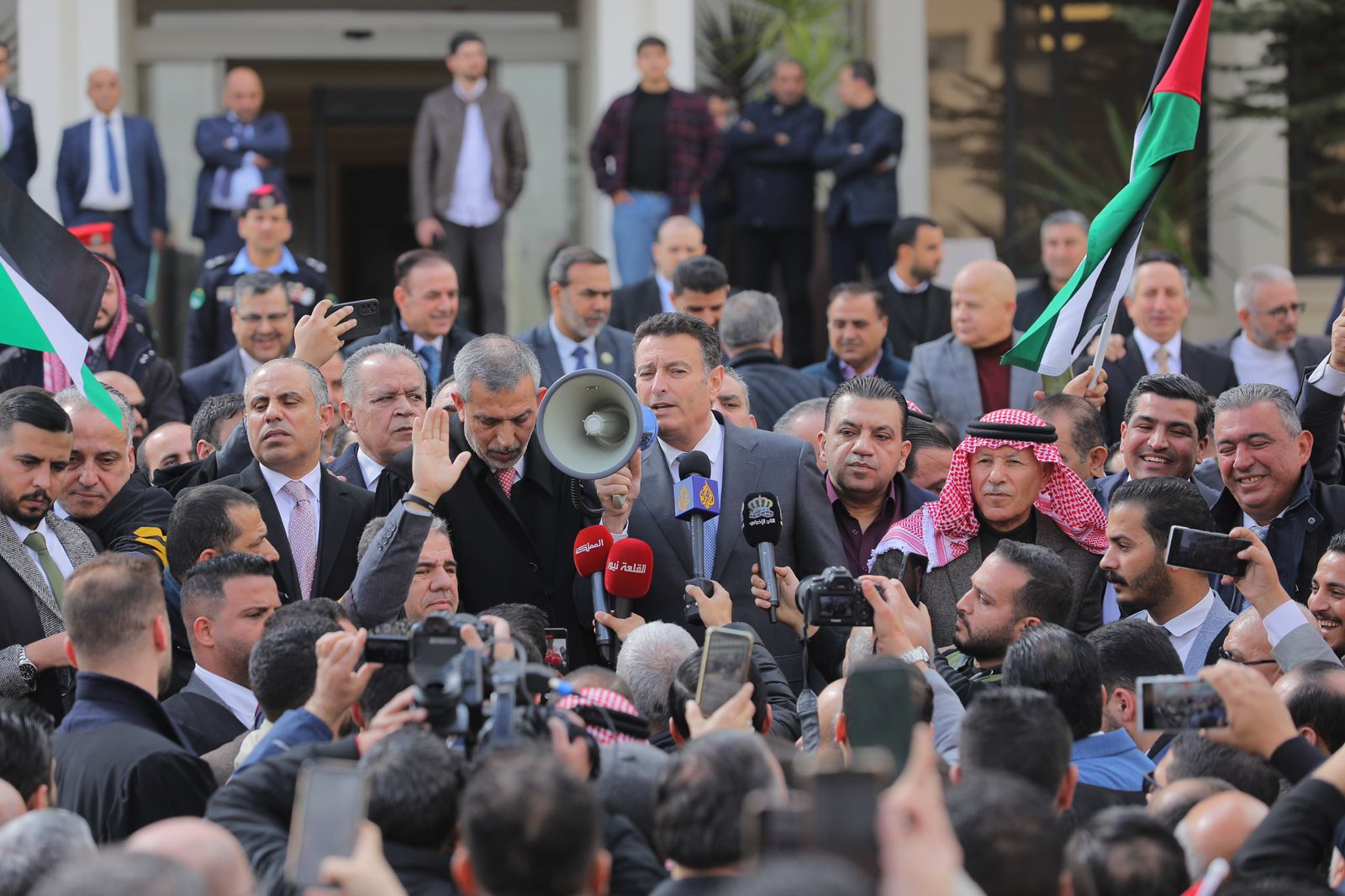 وهتف المحامون أمام المجلس بعبارات تؤكد صلابة الموقف الأردني والوقوف خلف جلالة الملك عبد الله الثاني برفض مخططات التهجير، ومساندة الأشقاء الفلسطينيين.