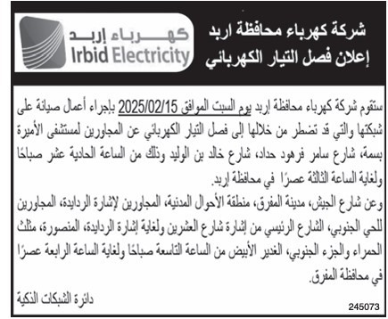 أعلنت شركات كهرباء عن تنفيذ فصل مبرمج للتيار الكهربائي في عدة مناطق بمحافظات الأغوار الشمالية وإربد والمفرق، وذلك لغايات أعمال الصيانة الدورية، خلال الأسبوع المقبل. وأوضحت الشركات أن جدول فصل التيار الكهربائي يتضمن المواعيد والمناطق المتأثرة، وفقًا لكل إعلان مرفق أدناه