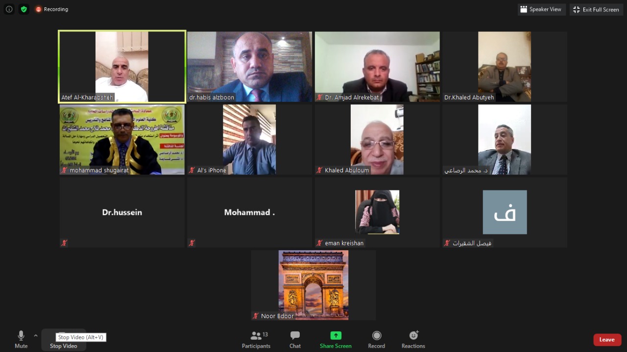 وتألفت لجنة المناقشة من: الأستاذ الدكتور محمد الرصاعي مشرفا، وعضوية الأستاذ الدكتور المثنى القسايمة والدكتور حابس الزبون والأستاذ الدكتور خالد ابو لوم عضوا وممتحنا خارجيا من الجامعة الاردنية.
