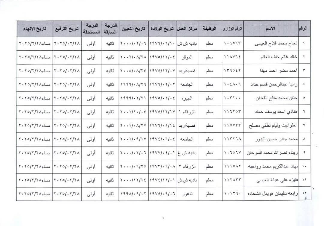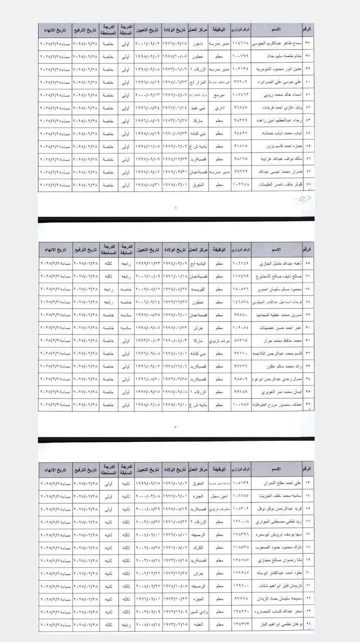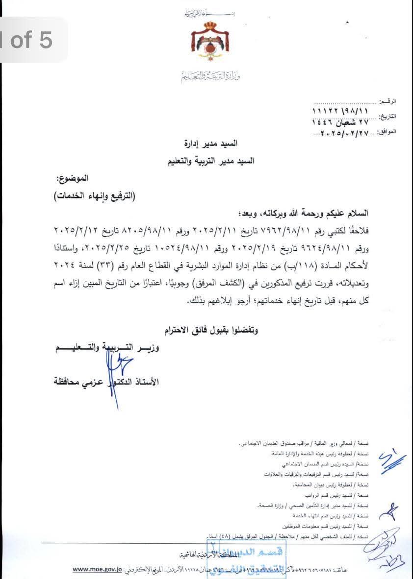 عمان، الأردن - قررت وزارة التربية والتعليم ترفيع 48 موظفًا بشكل وجوبي قبل إنهاء خدماتهم، وذلك استنادًا لأحكام المادة (118/ب) من نظام إدارة الموارد البشرية في القطاع العام رقم (33) لسنة 2024 وتعديلاته.
