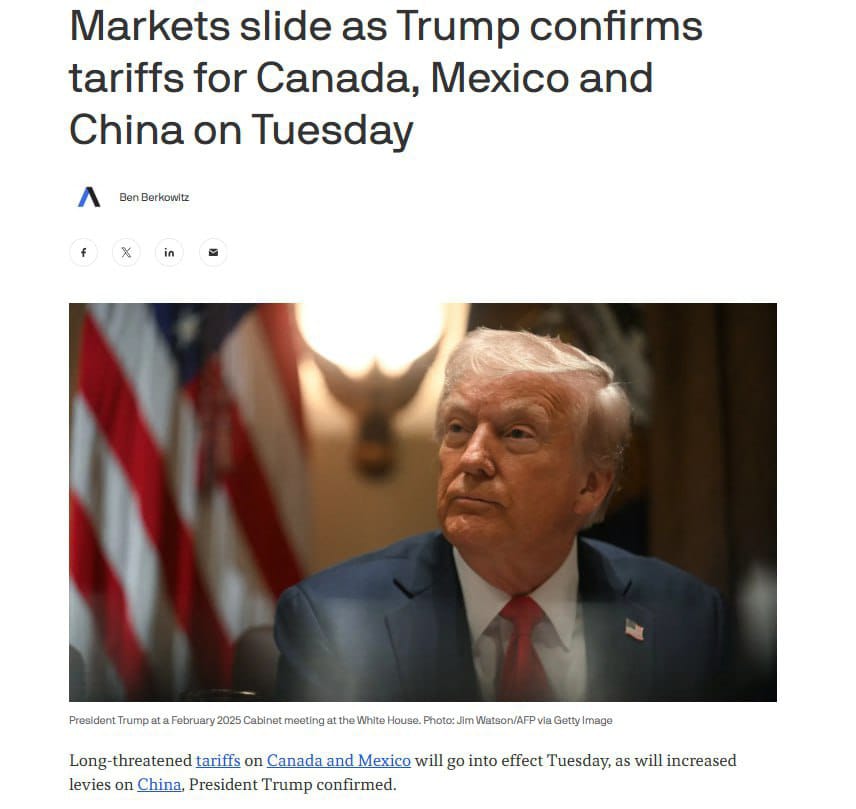 أكسيوس: "من المتوقع أن تؤدي الرسوم الجمركية إلى اندلاع حرب تجارية مع ثلاثة من أكبر الشركاء التجاريين للولايات المتحدة، مما قد يؤدي إلى ارتفاع الأسعار على مجموعة واسعة من السلع للمستهلكين الأمريكيين".