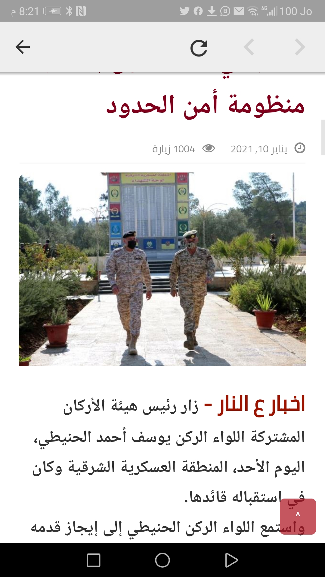 زار رئيس هيئة الأركان المشتركة اللواء الركن يوسف أحمد الحنيطي، اليوم الأحد، المنطقة العسكرية الشرقية وكان في استقباله قائدها. واستمع اللواء الركن الحنيطي إلى إيجاز قدمه قائد المنطقة، حول سير البرامج والأمور العملياتية والتدريبية واللوجستية في المنطقة، والمهام والواجبات المناطة بها والخطط التدريبية الحالية والمستقبلية التي ستنفذها المنطقة. وأكد اللواء الركن الحنيطي على استمرار القيادة العامة للقوات المسلحة الأردنية – الجيش العربي بتطوير منظومة أمن الحدود لتعزيز قدرتها على حماية الوطن والدفاع عن حدوده، والاهتمام بكافة الأمور المتعلقة بالقوات المسلحة بما يمكنهم من تنفيذ مهامهم وواجباتهم بكفاءة واقتدار.