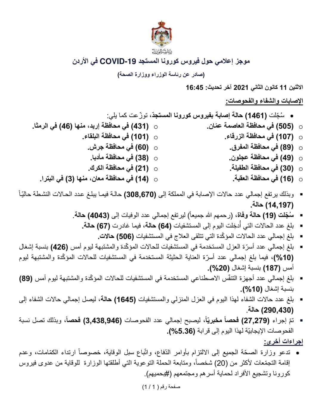 أخبار الأردن:سجل في المملكة اليوم 1461اصابة و 19 حالة وفاة.
