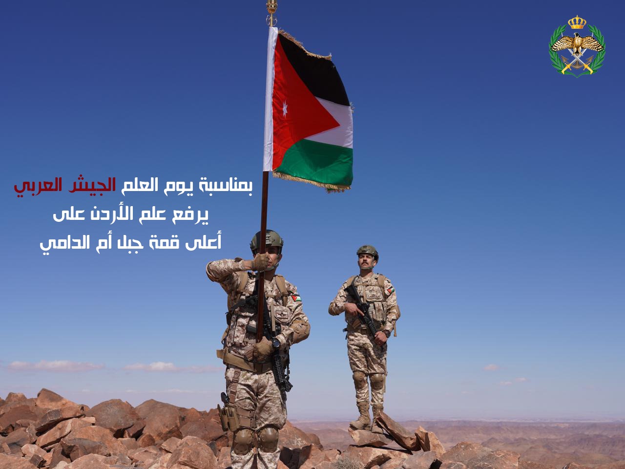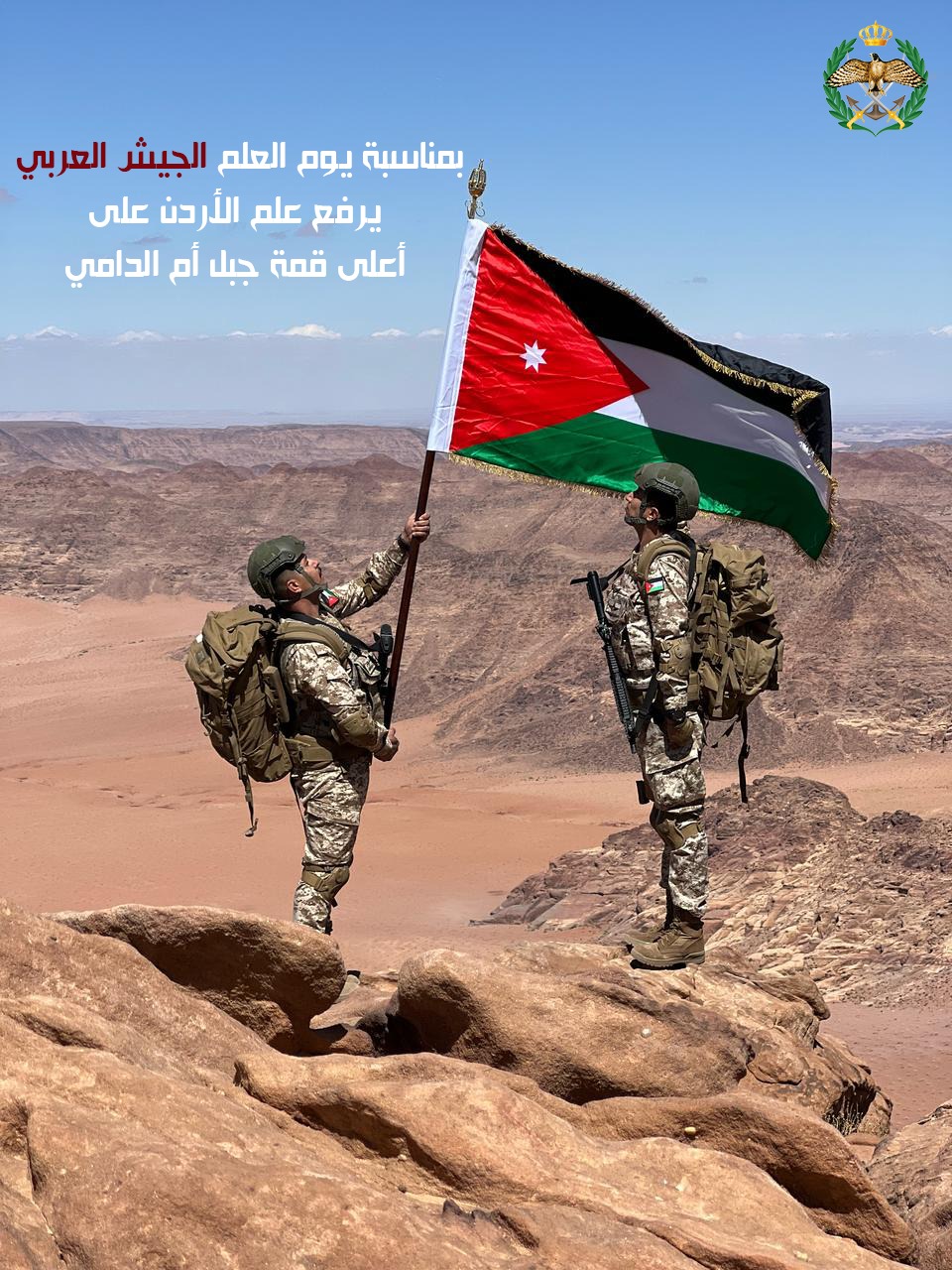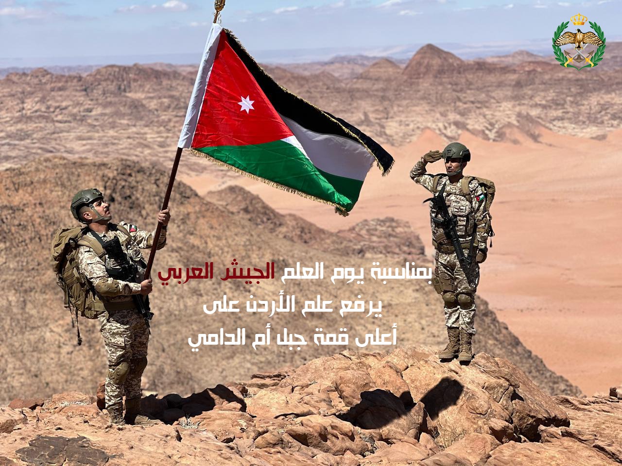 رفع عدد من مرتبات القوات المسلحة الأردنية، اليوم الثلاثاء، علم المملكة الأردنية الهاشمية على أعلى قمة جبلية في الأردن، جبل "أم الدامي"، وذلك تزامنًا مع احتفالات المملكة بيوم العلم الذي يصادف السادس عشر من نيسان كل عام.