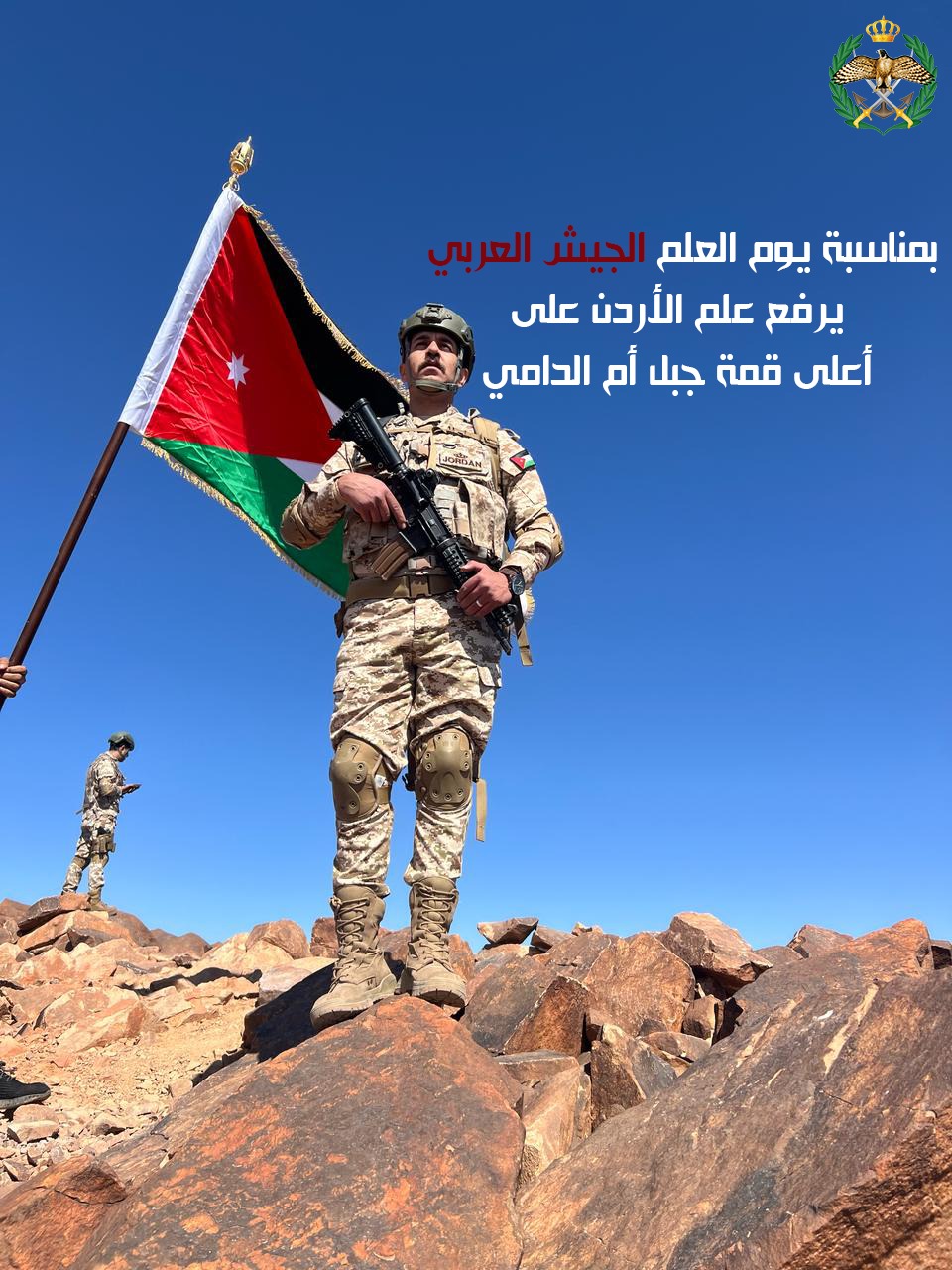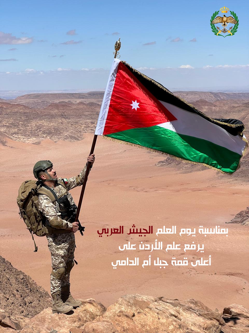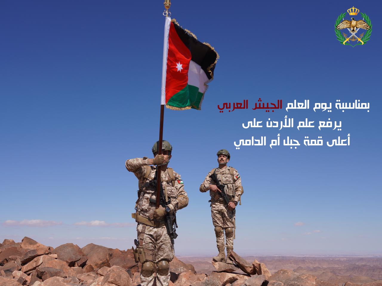 رفع عدد من مرتبات القوات المسلحة الأردنية، اليوم الثلاثاء، علم المملكة الأردنية الهاشمية على أعلى قمة جبلية في الأردن، جبل "أم الدامي"، وذلك تزامنًا مع احتفالات المملكة بيوم العلم الذي يصادف السادس عشر من نيسان كل عام.