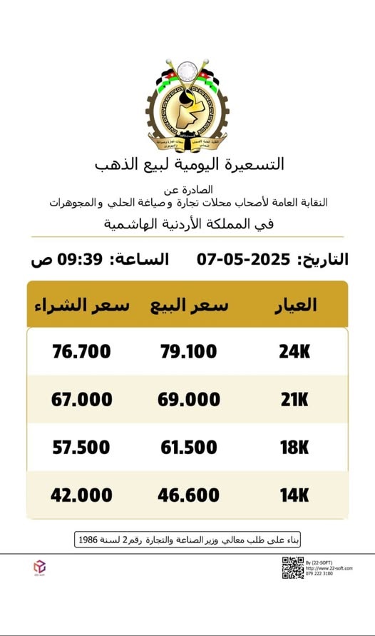 وحسب النشرة اليومية التي أصدرتها النقابة العامة لأصحاب محلات تجارة وصياغة الحلي والمجوهرات، بلغ سعر الغرام الواحد من الذهب عيارات 24 و18 و14 لغايات البيع من محلات الصاغة عند 79.10 و61.50 و46.60 دينار على التوالي