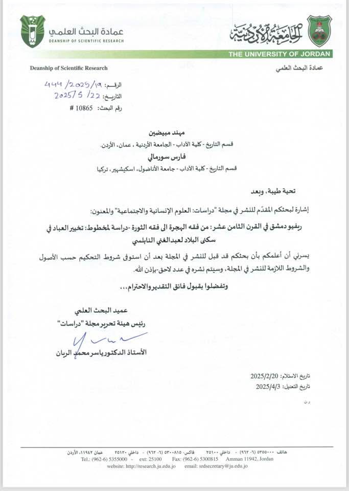 الجامعة الأردنية تعلن قبول نشر بحث " ريف دمشق " للدكتور مهند مبيضين بعد جهود بحثية استمرت منذ 2017