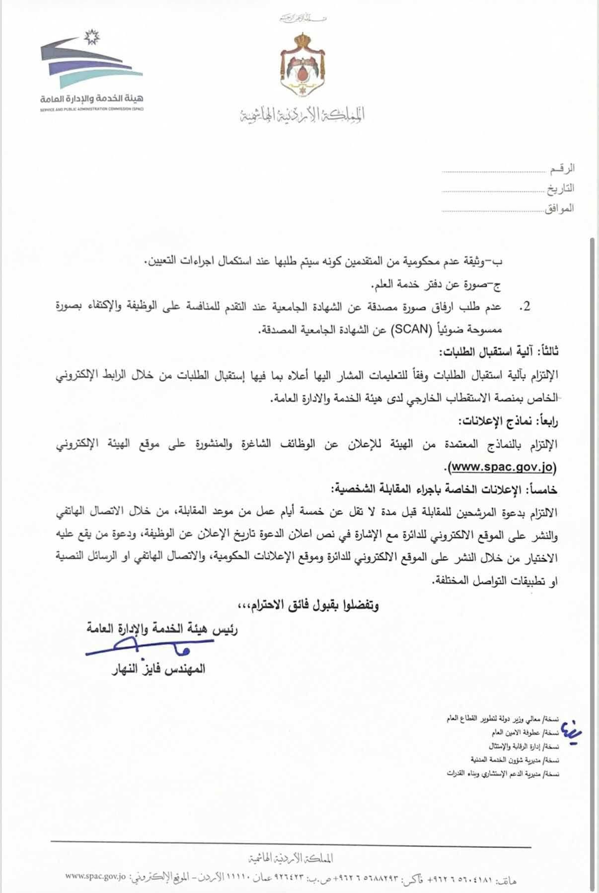 وقد وقع رئيس هيئة الخدمة والإدارة العامة، المهندس فايز النهار، على هذا التعميم، مؤكداً التزام الهيئة بتطبيق هذه الإجراءات الجديدة لضمان الشفافية والعدالة في عمليات التوظيف الحكومي.