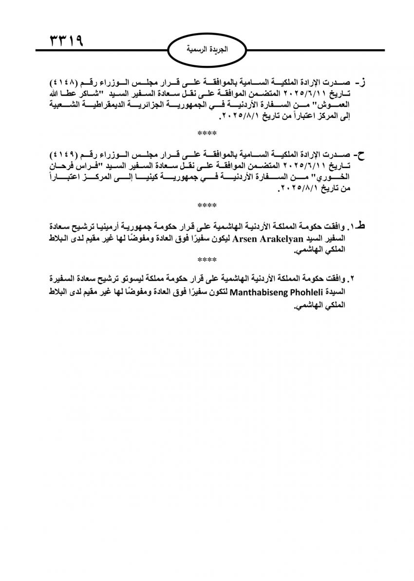 وصدرت الإرادة الملكية السامية بالموافقة على قرار مجلس الوزراء المتضمن نقل السفير شاكر عطا الله العموش من السفارة الأردنية في الجمهورية الجزائرية الديمقراطية الشعبية إلى المركز اعتباراً من تاريخ ٢٠٢٥/٨/١.