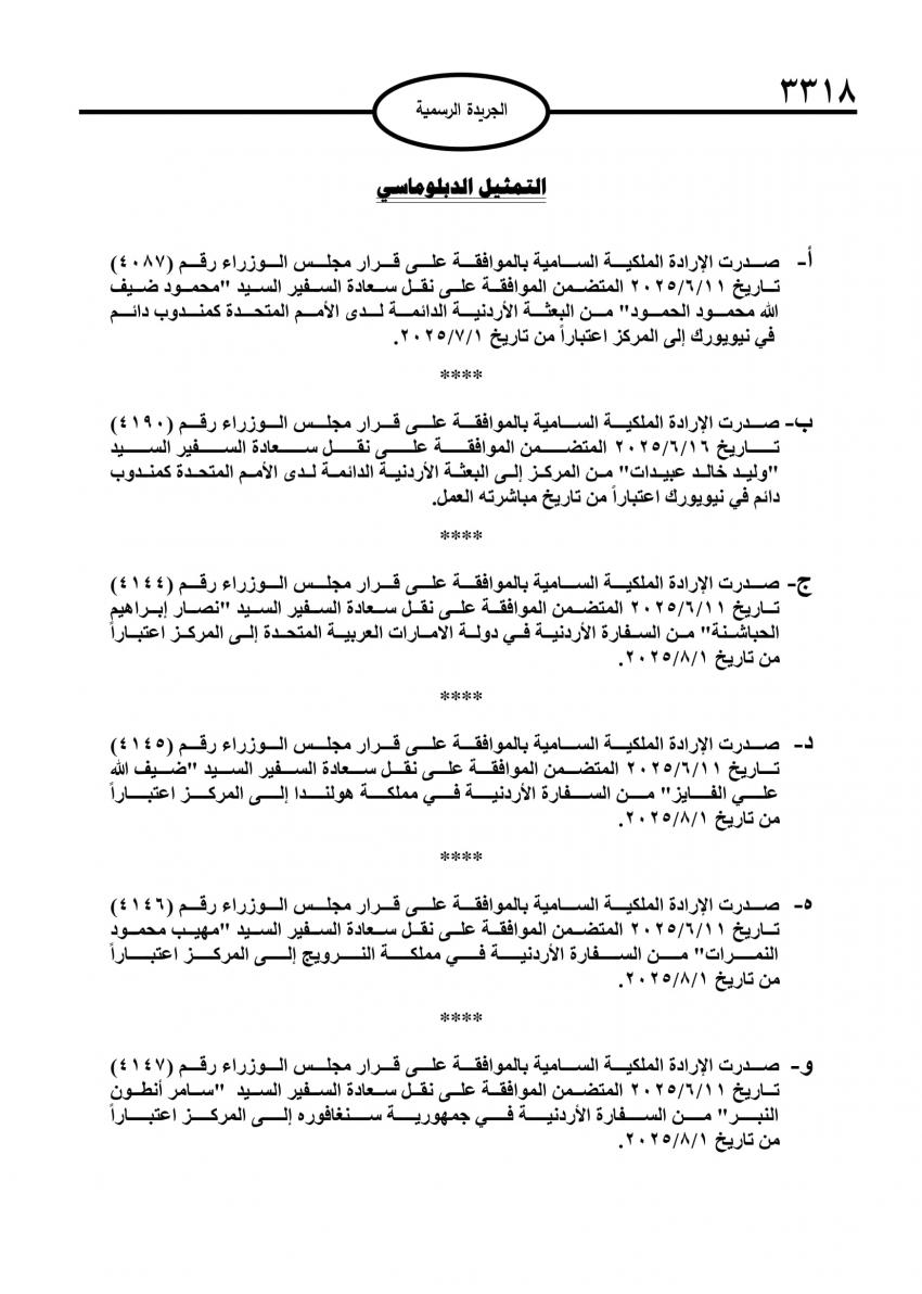 كما صدرت الإرادة الملكية السامية بالموافقة على قرار مجلس الوزراء المتضمن نقل السفير مهيب محمود النمرات من السفارة الأردنية في مملكة النرويج إلى المركز اعتباراً من تاريخ ٢٠٢٥/٨/١.