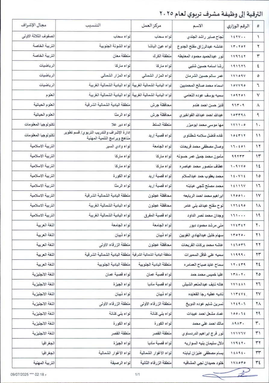 وزارة التربية والتعليم تعلن عن ترقية دفعة جديدة من الكفاءات إلى وظيفة مشرف تربوي وأخصائي مبحث (اسماء )