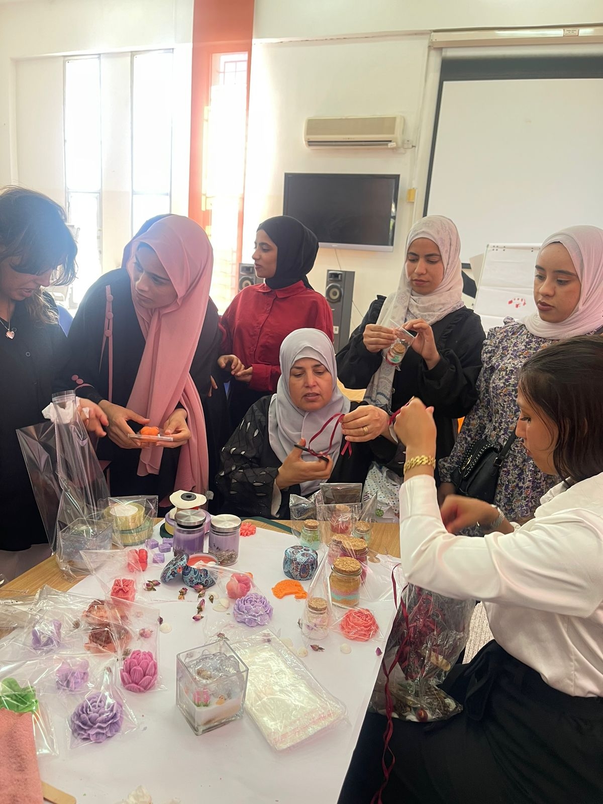 قامت المدربة صباح الحسين بتدريب المشاركات على كيفية صب وتشكيل الشموع في قوالب مختلفة