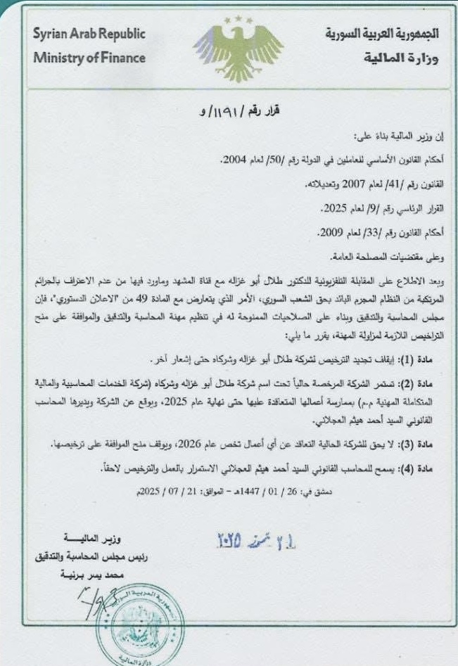 عاجل - وزير المالية السوري يصدر قراراً بإيقاف تجديد ترخيص "شركة طلال أبو غزالة وشركاه"