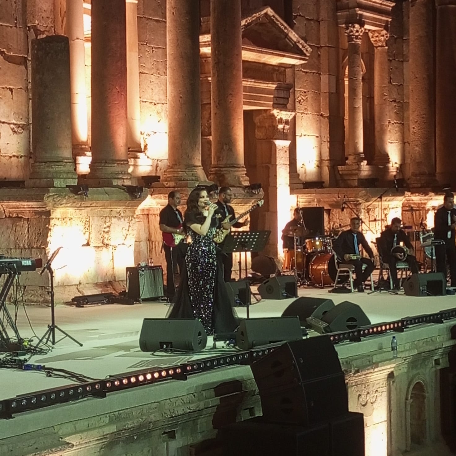 وخاطبت جمهورها بمساء الورد والأردن الحبيب واشادت بالحضور الجماهيري الكبير في المسرح ورحبت بالفرقة الموسيقية ، واكملت حفلتها بأغنية " حنا كبار البلد" ليكون الجمهور شريكا لها في ترديد الاغنية ، وذهبت إلى المواويل الوطنية لتذهب الى اغنية علمنا عالي ، حيث ابدعت في تحريك الجمهور وتفعيله مع كل نغمة على المسرح وعبر إيقاع أغانيها .