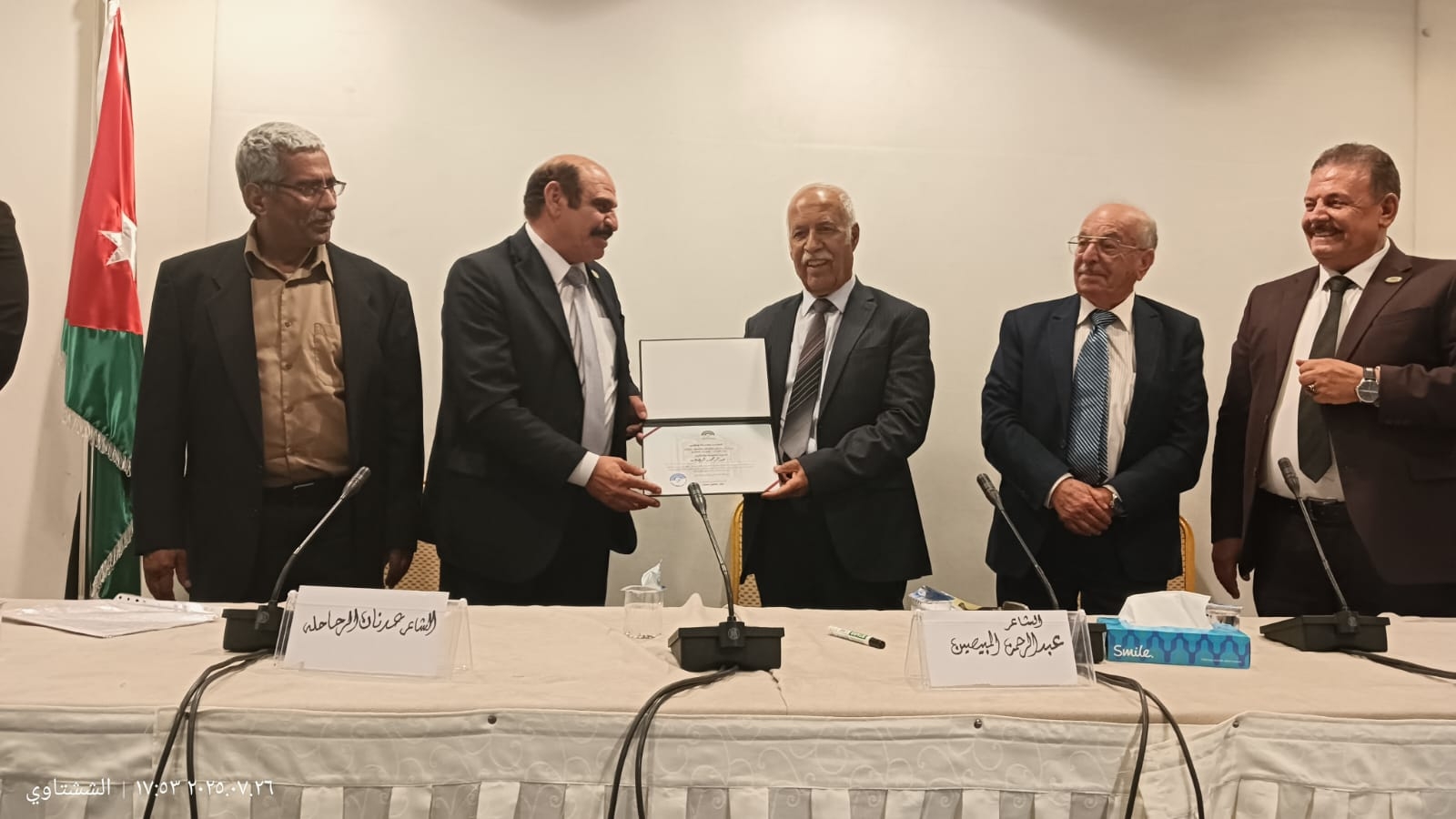 وفي ختام الفعاليتين، كرم رئيس الاتحاد الشاعر عليان العدوان المشاركين بالشهادات التقديرية لهم من إدارة مهرجان جرش على إبداعاتهم في هذه الدورة الفريدة من مهرجان جرش للثقافة والفنون "39".