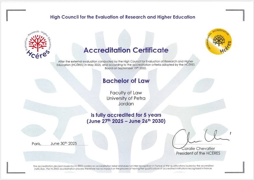 حققت كلية الحقوق في جامعة البترا إنجازًا أكاديميًا متميزًا بحصولها على الاعتماد الفرنسي من المجلس الأعلى لتقييم البحث العلمي والتعليم العالي (HCÉRÉ) لمدة خمس سنوات. ويُعد هذا المجلس من أبرز الهيئات الأوروبية المعنية بتقييم البرامج الجامعية وفقًا لأعلى معايير الجودة والتميّز الأكاديمي.