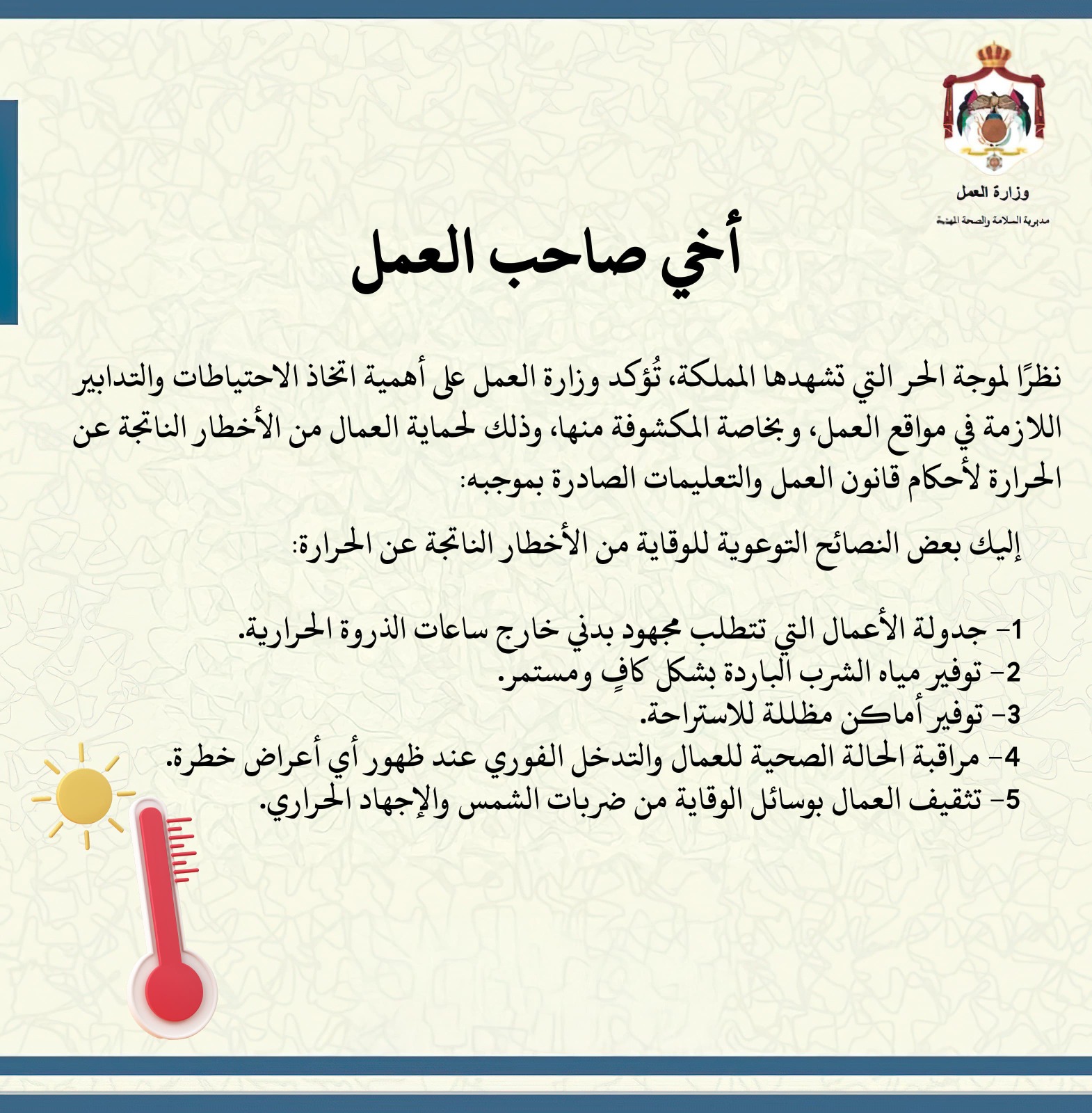 ودعا أصحاب العمل إلى جدولة الأعمال التي تتطلب مجهود بدني خارج ساعات الذروة الحرارية، توفير مياه الشرب الباردة بشكل كافٍ ومستمر، توفير أماكن مظللة للاستراحة، مراقبة الحالة الصحية للعمال والتدخل الفوري عند ظهور أي أعراض خطرة وتثقيف العمال بوسائل الوقاية من ضربات الشمس والإجهاد الحراري.
