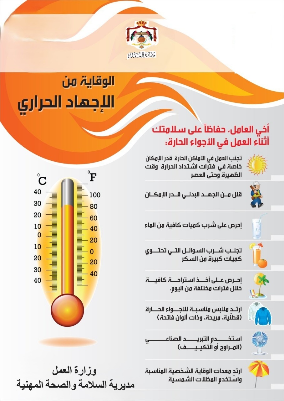 وقال الناطق الإعلامي للوزارة محمد الزيود إن توجيهات الوزير جاءت لحث أصحاب العمل على وضع خطط استباقية وبيان جاهزيتهم للتعامل مع الحالات الطارئة في هذه الأحوال الجوية واتخاذ الاحتياطات والتدابير اللازمة لحماية العاملين لديهم من الاخطار الناجمة عن الاجهاد الحراري وذلك بما يتماشى مع قانون العمل والأنظمة والتعليمات والقرارات الصادرة بموجبه.