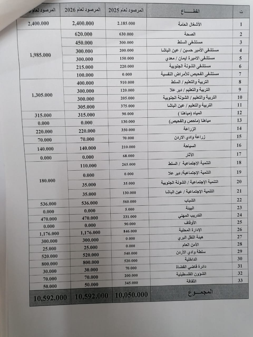 ترأس رئيس لجنة مجلس محافظة زياد السمردلي، بحضور نائب المحافظ علي البطاينة، اجتماعاً هاماً تم خلاله الموافقة على إقرار موازنة محافظة البلقاء لعام 2026، والتي تبلغ قيمتها (10,592,000) عشرة ملايين وخمسمائة واثنان وتسعون ألف دينار.